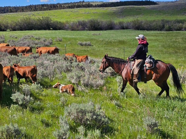 Image 2 Caption: Julie and one of her prize dogs, "Peaches" moving their Hidden Hollow Ranch Red Angus herd to a new pasture.