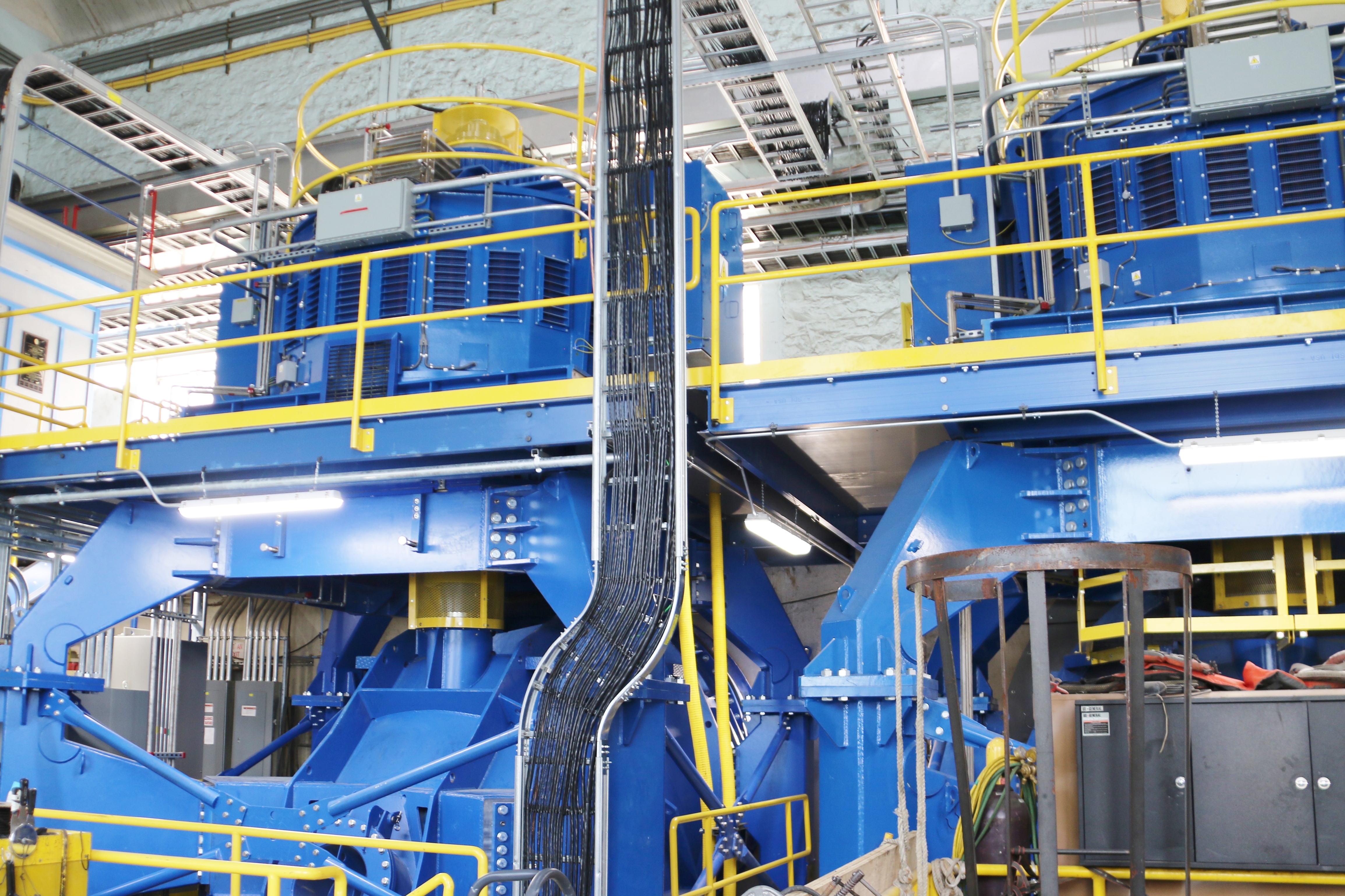 One of the original generators has a name plate that says, “Alternating Current Generator, 2800 K.W. (Kilowatts), 2400 Volts, 674 Amps per Terminal, 3 Phase, 60 cycles.” The newer generators can produce 4 Megawatts of power, and through transformers, the 2400 volts are reduced to 120 Volts AC and wired to the power grids.