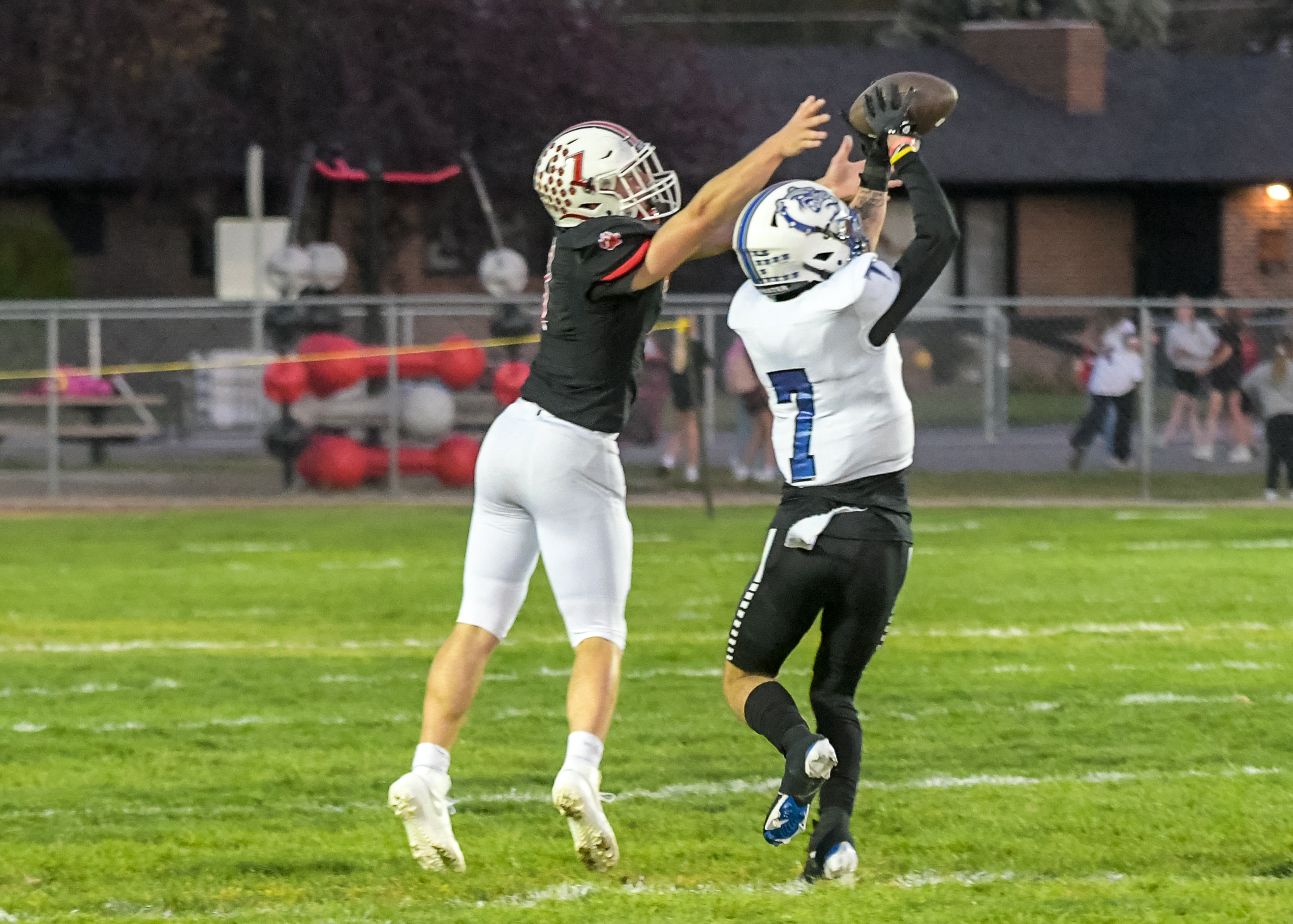 Image 1 Caption: Bulldog DB Colt Barnard breaks up a pass to Wolves WR Marcus Pestel during last Friday's game against Three Forks