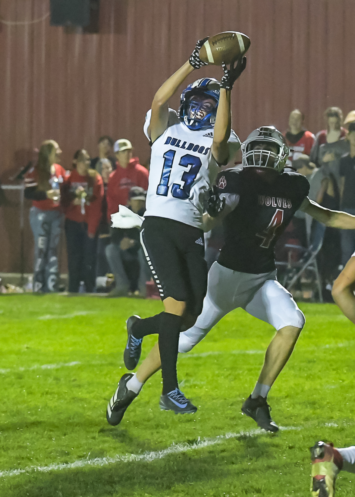 Image 2 Caption: Bulldog WR Logan Johnson catches a long pass from QB Tavyn Anderson and takes it in for a touchdown in last Friday's game against Three Forks.