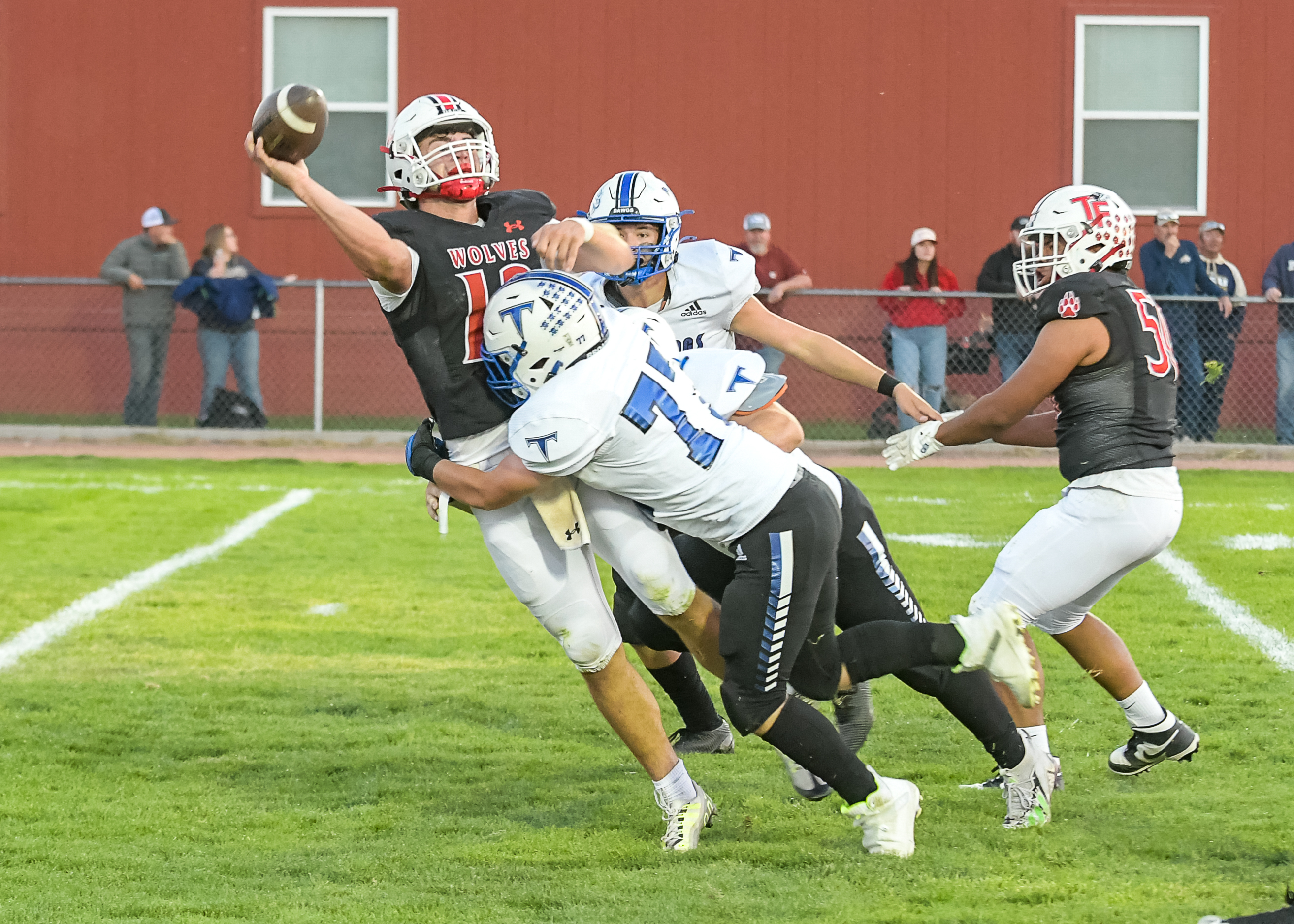 Image 3 Caption: Bulldog DL Tanner Bird puts the pressure on the Wolves QB Kanon Reichman during last Friday's game against Three Forks.