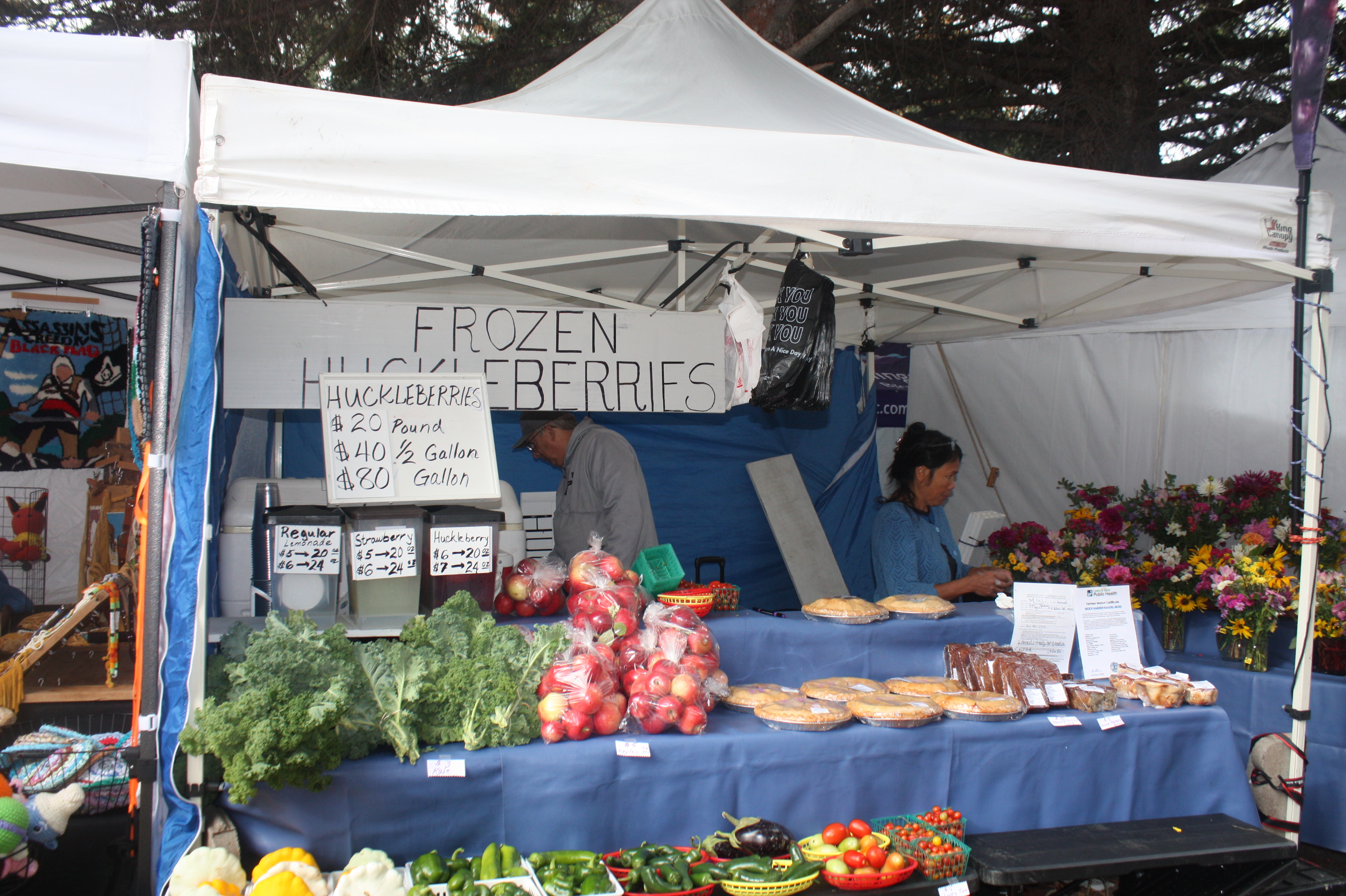 Image 1 Caption: A Missoula vendor displays fresh vegetables and homemade pies.