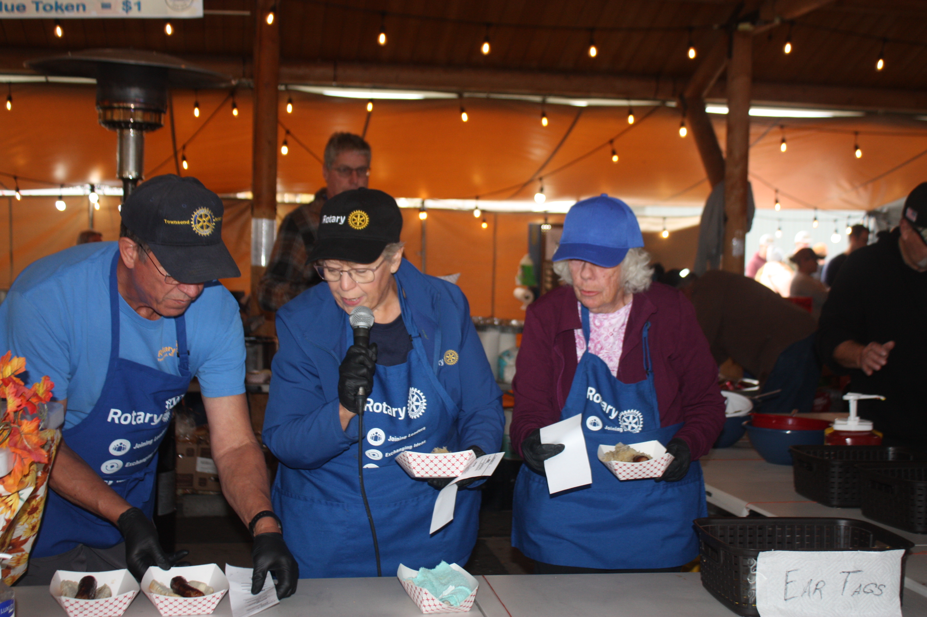 Image 2 Caption: Brat sellers and Rotarians Jeff Langlinais, Elaine Roy and a volunteer call out order numbers at the Brat stand.