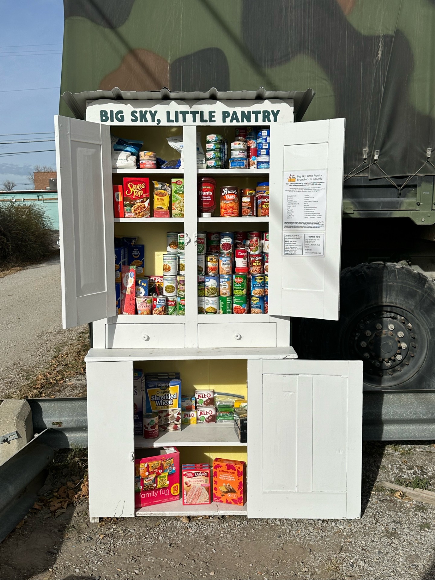 Big Sky, Little Pantry Broadwater County, was started in April as a project that came out of a nine-month Big Sky, Big Leadership course offered through the Broadwater County Extension Office. Class members Kasee Clark, Brittany DesChene, and Katie Erb were tasked to develop an impactful community service project. Their goal was to establish a 24/7 resource for food assistance, while allowing users anonymity. The Little Pantry is free for all community members to take what they need and leave what they can.