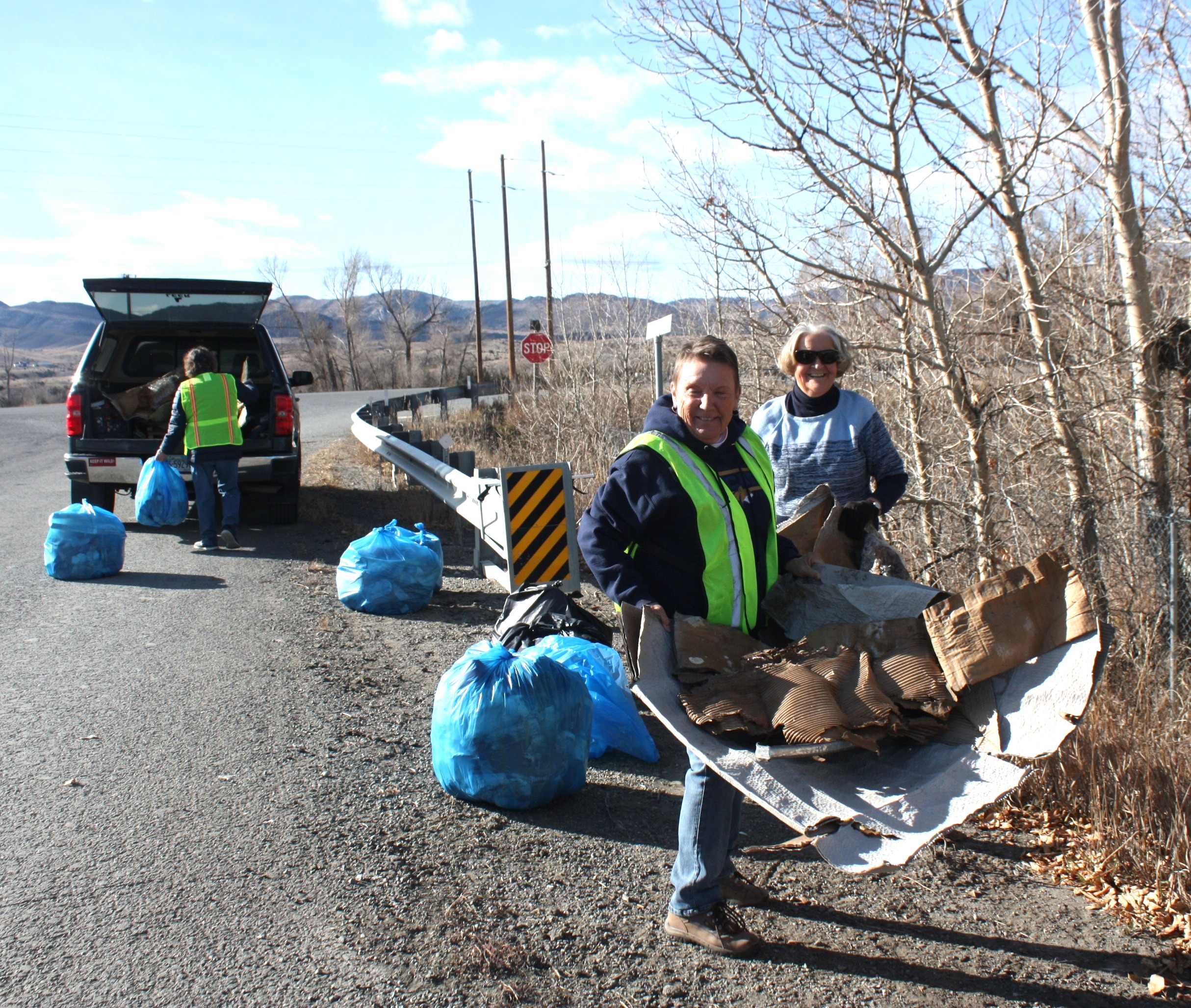 Image 1 Caption: Teresa Patterson, Dawn Langlinais and Gayle Clifford load bags of garbage near Indian Campground after a morning picking up highway litter.