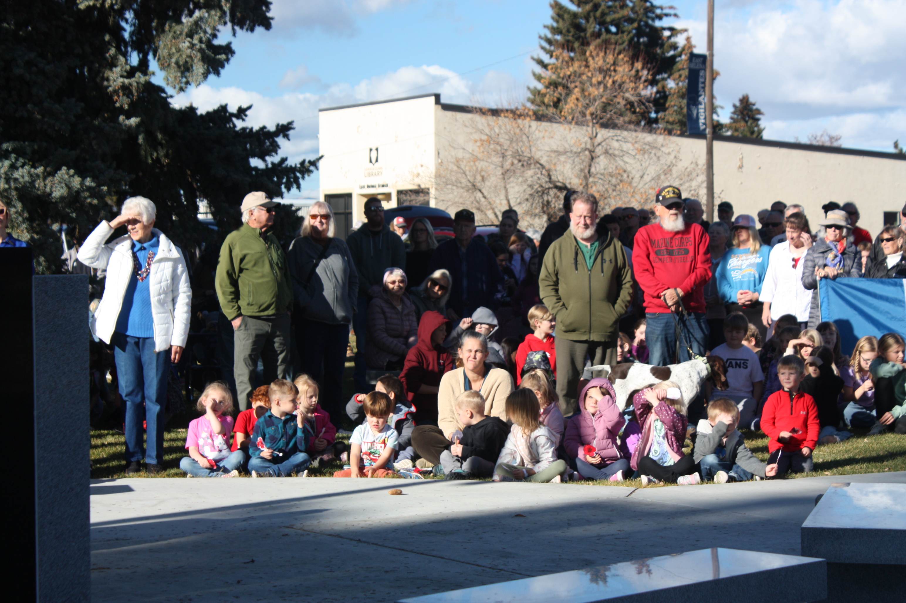 Image 2 Caption: Children and parents listen during the Veterans' Day Ceremony at Main Street Park.