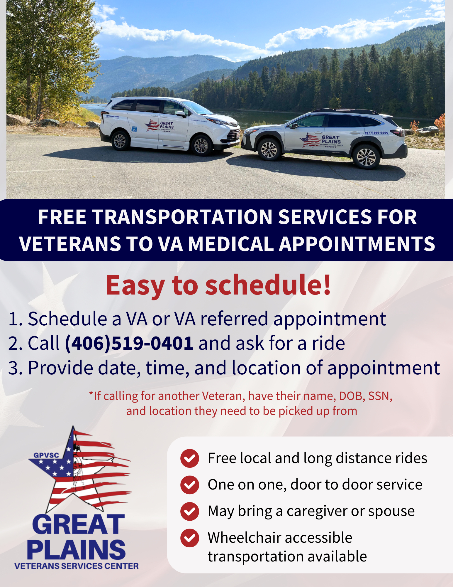 The Great Plains Veterans Services Center (GPVSC) continues to strengthen support for Montana’s rural Veterans through its expanding Transportation Program. This no-cost service provides safe, reliable rides to VA and VA-referred medical appointments across 45 rural counties, ensuring Veterans never miss critical healthcare due to distance or lack of transportation. Powered by the VA’s Highly Rural Transportation Grant, the program has grown significantly since launch, reflecting increased demand for long-distance transportation support in highly rural communities.