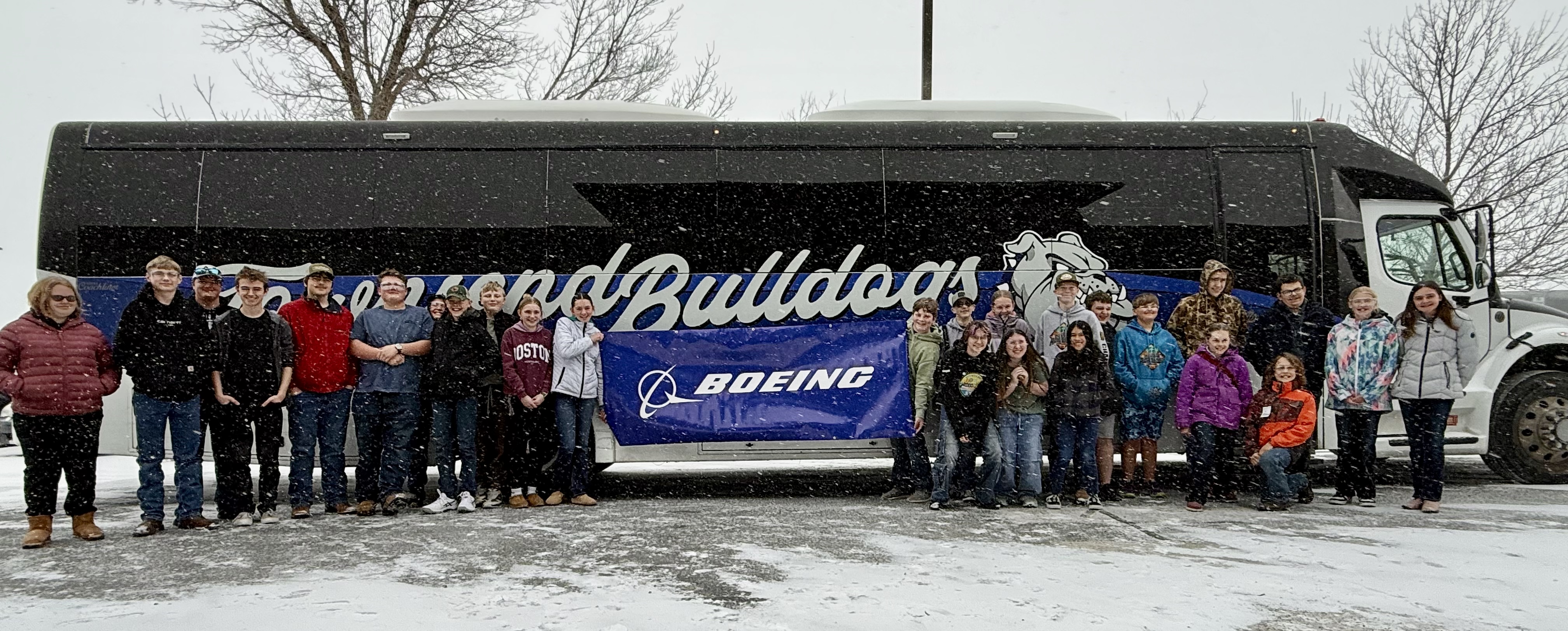 Image 2 Caption: Broadwater Robotics students stand in front of the Bulldog school bus holding a Boeing banner after their tour in Helena as snow falls.
