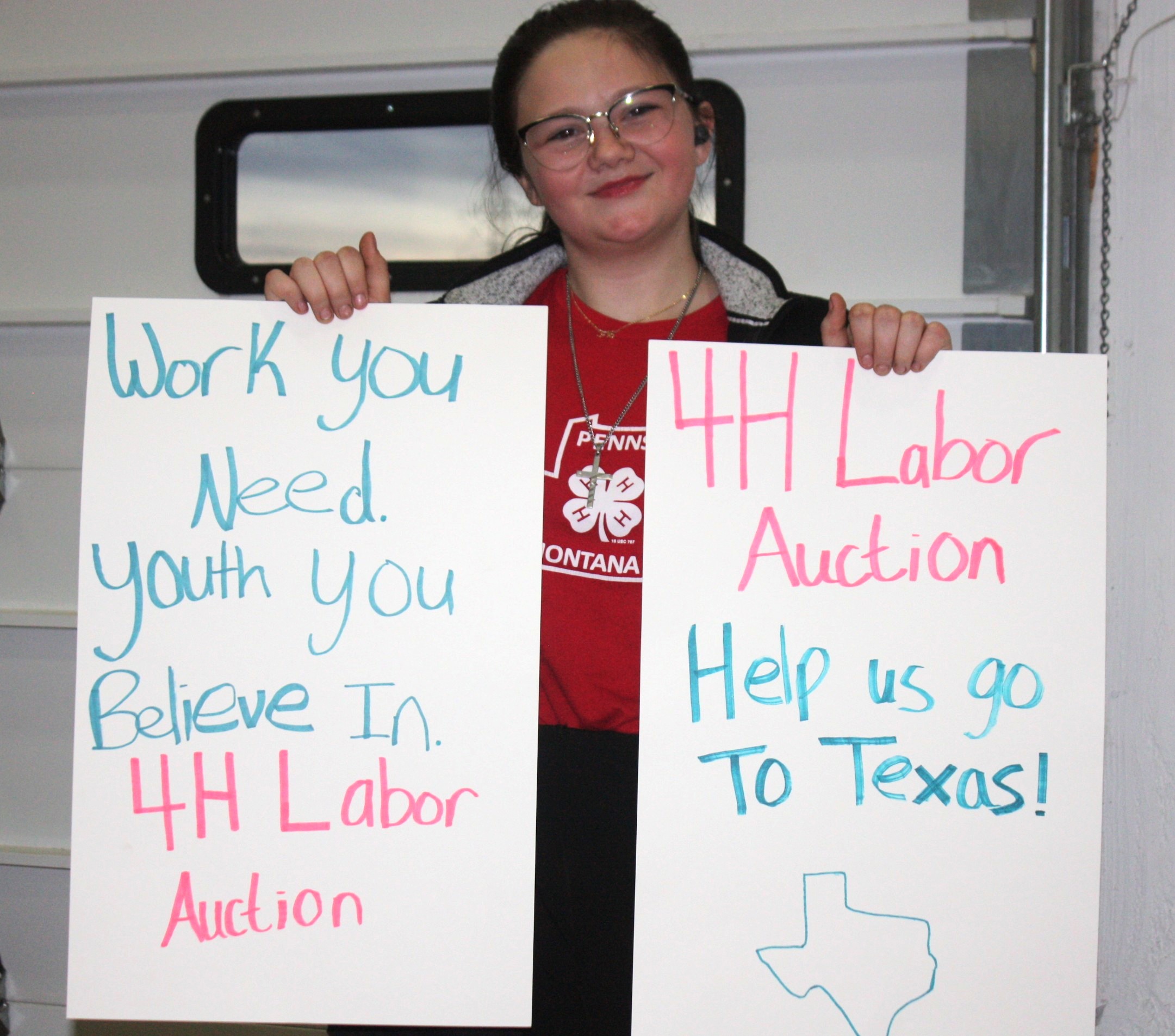 Image 3 Caption: 4-H Exchange Club member Autumn Henke holds signs to encourage buyers to purchase "work for pay" laborers to raise money for their upcoming trip to Texas.