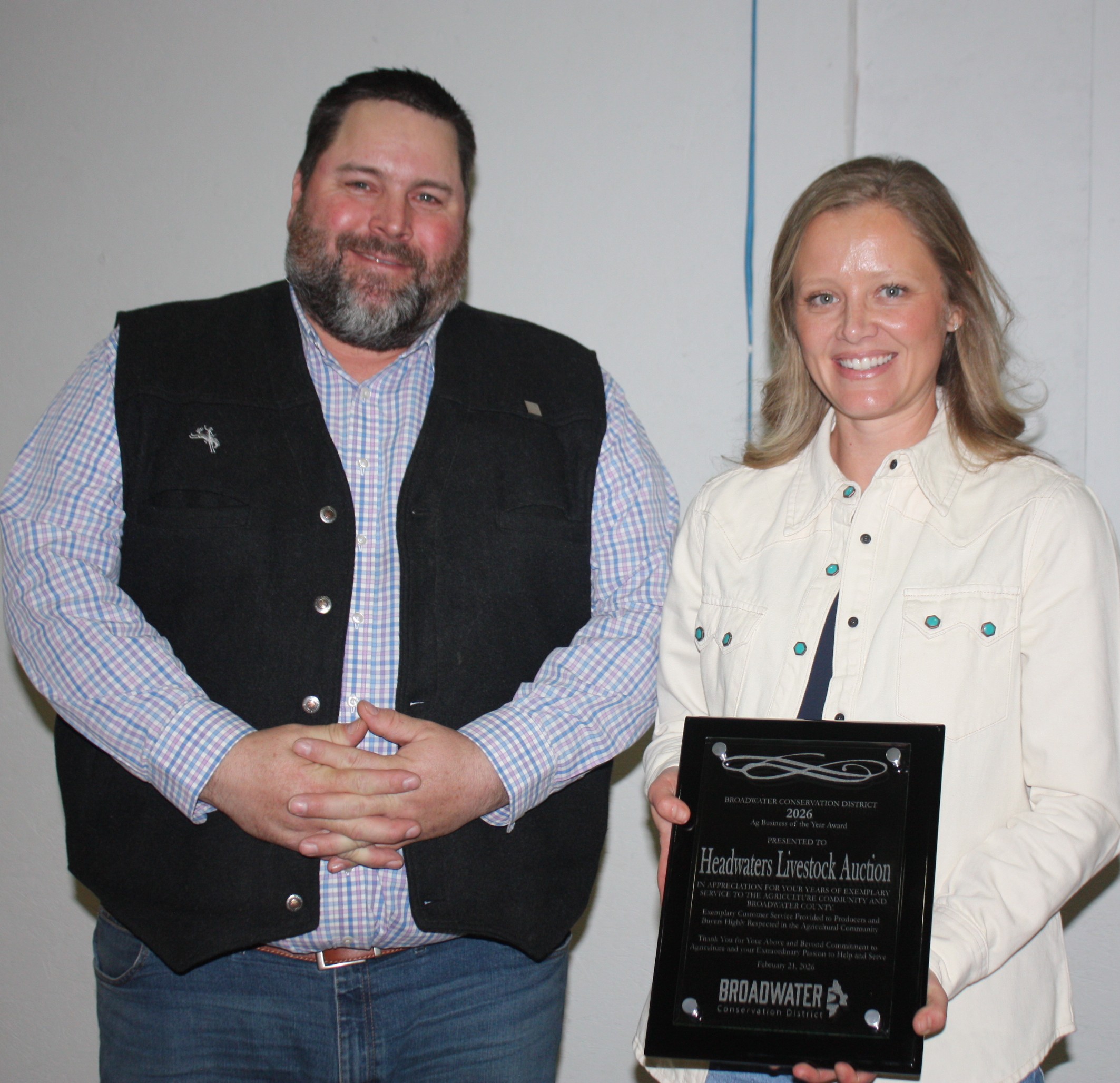 Turn-out for the dinner, held at the Watson Event Center, was exceptional with over 200 people attending. Chef Gayle Watson’s prime rib dinner was served by Broadwater 4-H Club and Future Farmers of America Club members. Conservation District Chairman Dallas Diehl presented the Business of the Year award to Headwaters Livestock Auction and the Steward Award to longtime fisheries management biologist Ron Spoon. Spoon, now retired, has worked with farmers and ranchers and their water projects 36 years.