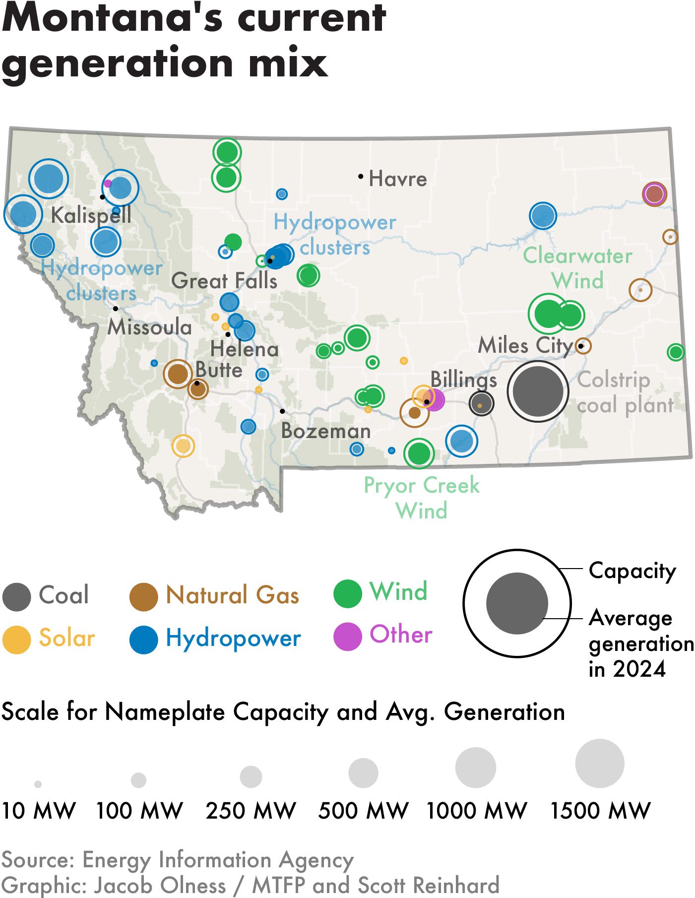 The largest class of generation in the state, in contrast, is hydropower: Western Montana dams can generate more than 2,500 megawatts of power when they’re operating at full capacity.