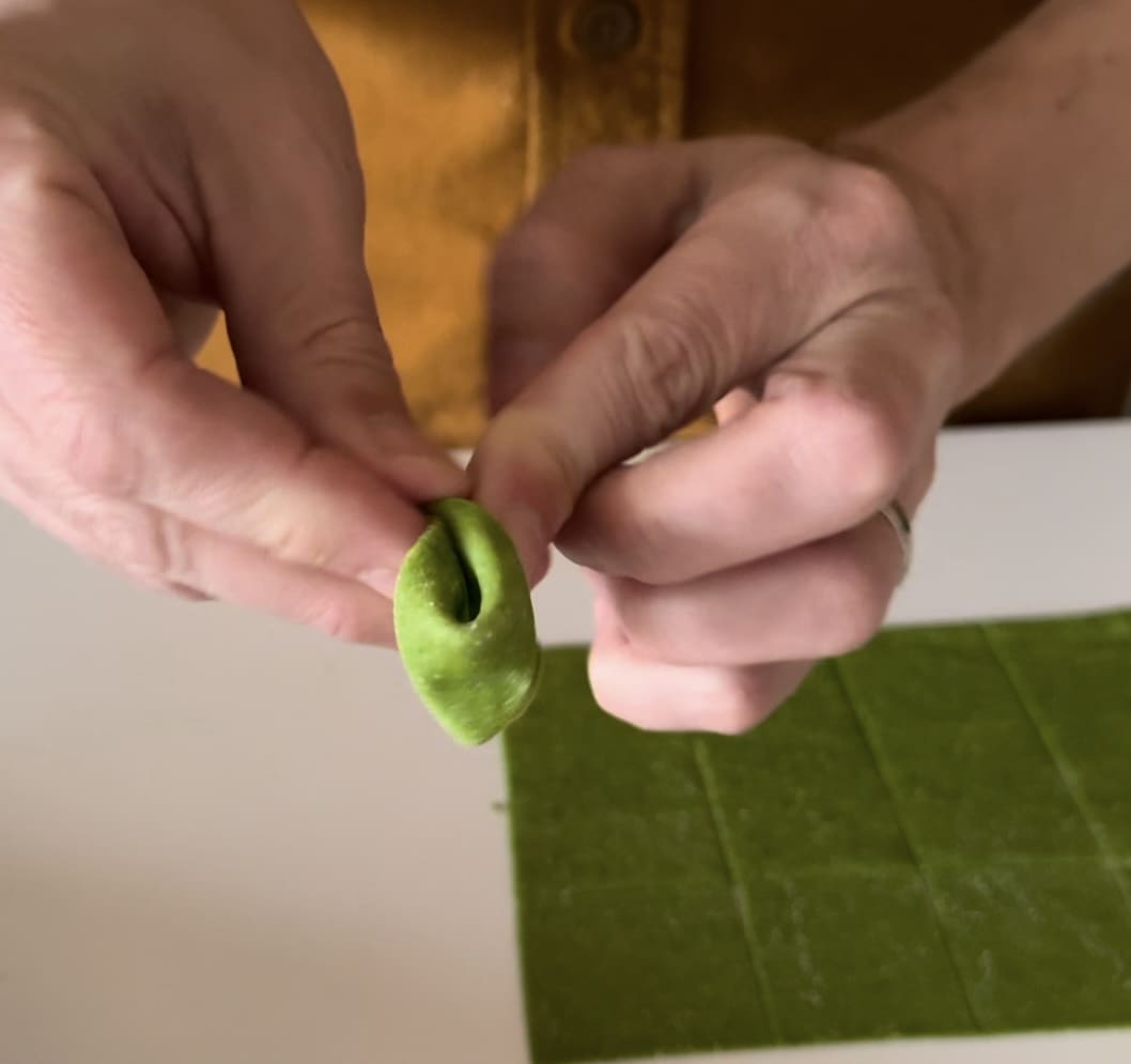 Once you have a sheet of pasta to work with, use a pizza cutter to make 1 1/2” squares. You want them to be as close to square-shaped as possible, since rectangles will lead to odd-looking sorpresine. To fold the sorpresine, first take two opposite corners of the square and pinch them together. If it won’t stick, use just a touch of water. Now bring the other two opposing corners together to meet in the other direction, pointing away from the first pinch. You can use your thumb to indent the middle of the square to help bring those second corners together.