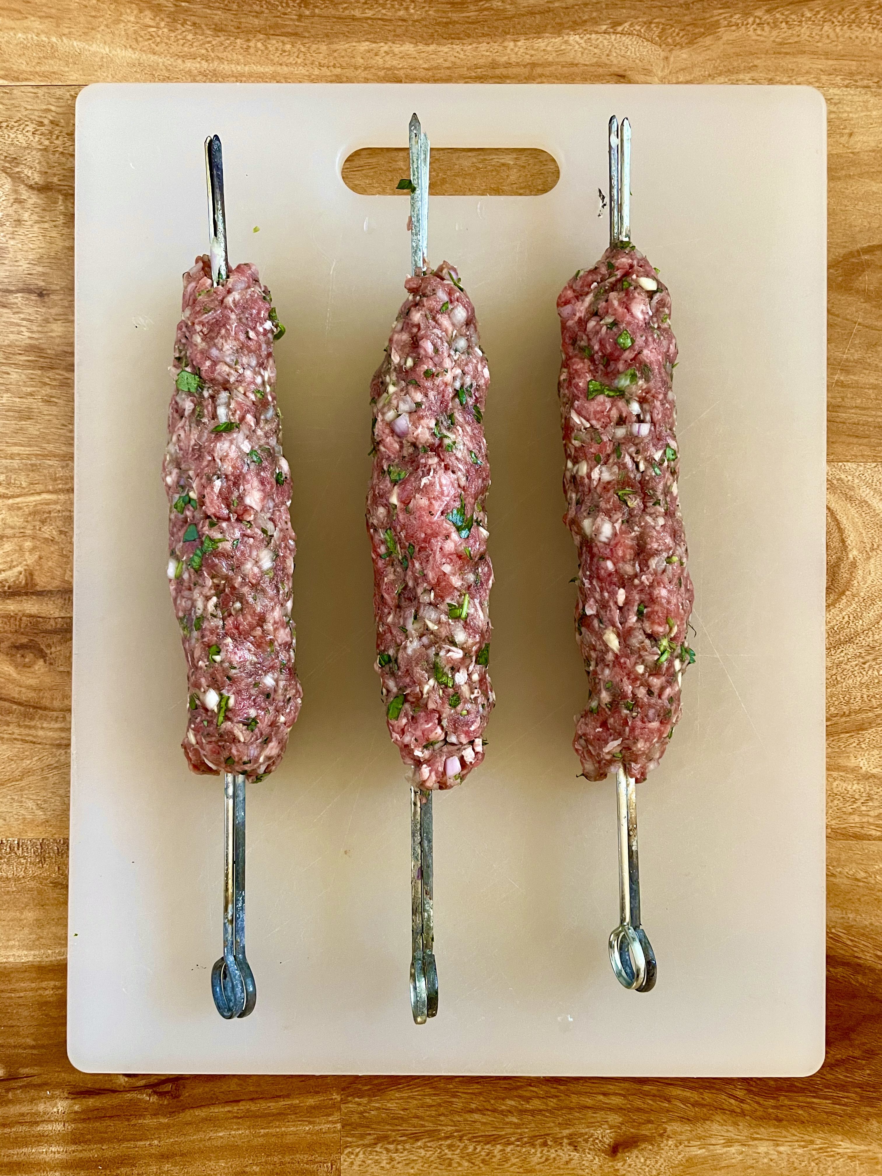 The ground beef gets mixed with finely minced onion and garlic and fresh herbs like parsley and cilantro, then well-seasoned with salt, pepper, and cumin. In the Middle East, they often use sword-like skewers with a wide surface area that can hold a lot of meat without it falling off.