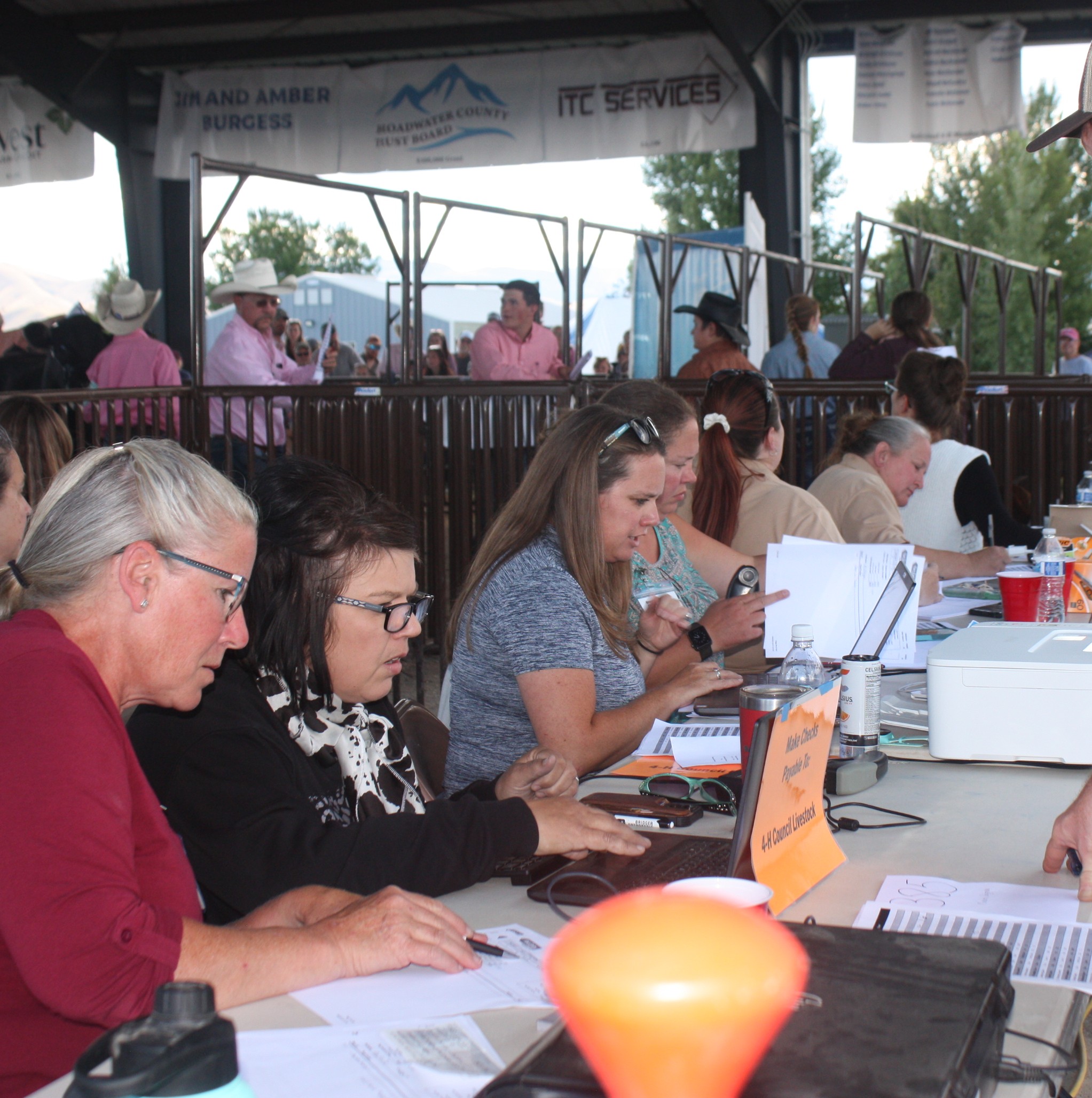 The table of dedicated volunteer ladies keeps track of auction numbers, check numbers and who buys what. The faster sales move the more stress on the keepers of the purse. When it is all over, everyone gets busy taking down sales ring, corrals and bleachers, ending a long night of excitement, fun and hard work. For another year, that is.