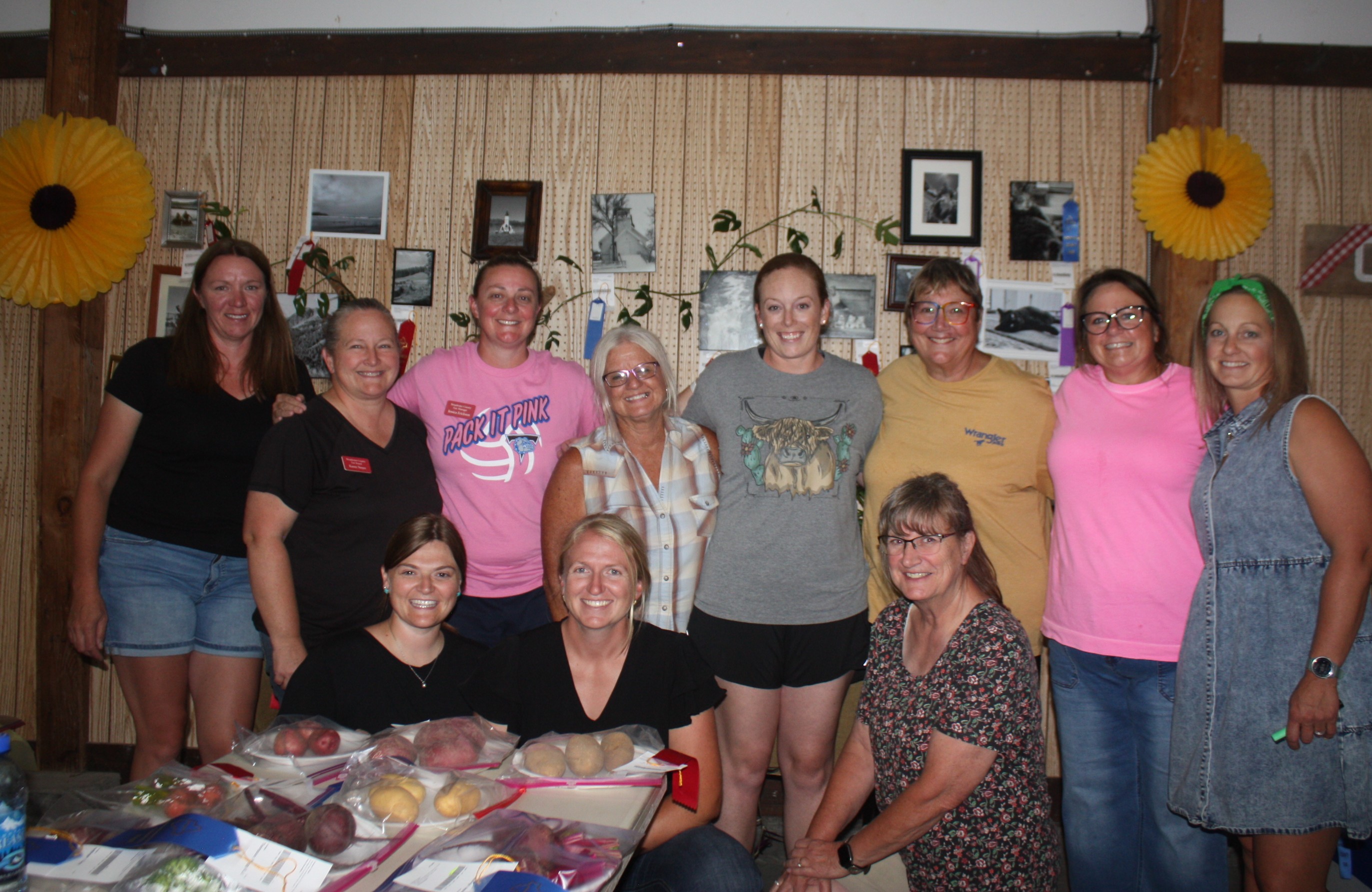 Image 1 Caption: Volunteers stop for a photo during their wild time checking in and judging open class entries at the 4-H building. From left: Becky Flynn, Karen Noyes, Fair Manager Jessica Erickson, Jodi Hauser, Emily Clark, Val Hornsveld, Desiree Taves, Amy Courence, Tayla Snapp, Kasee Clark and Deanna Gobbs.