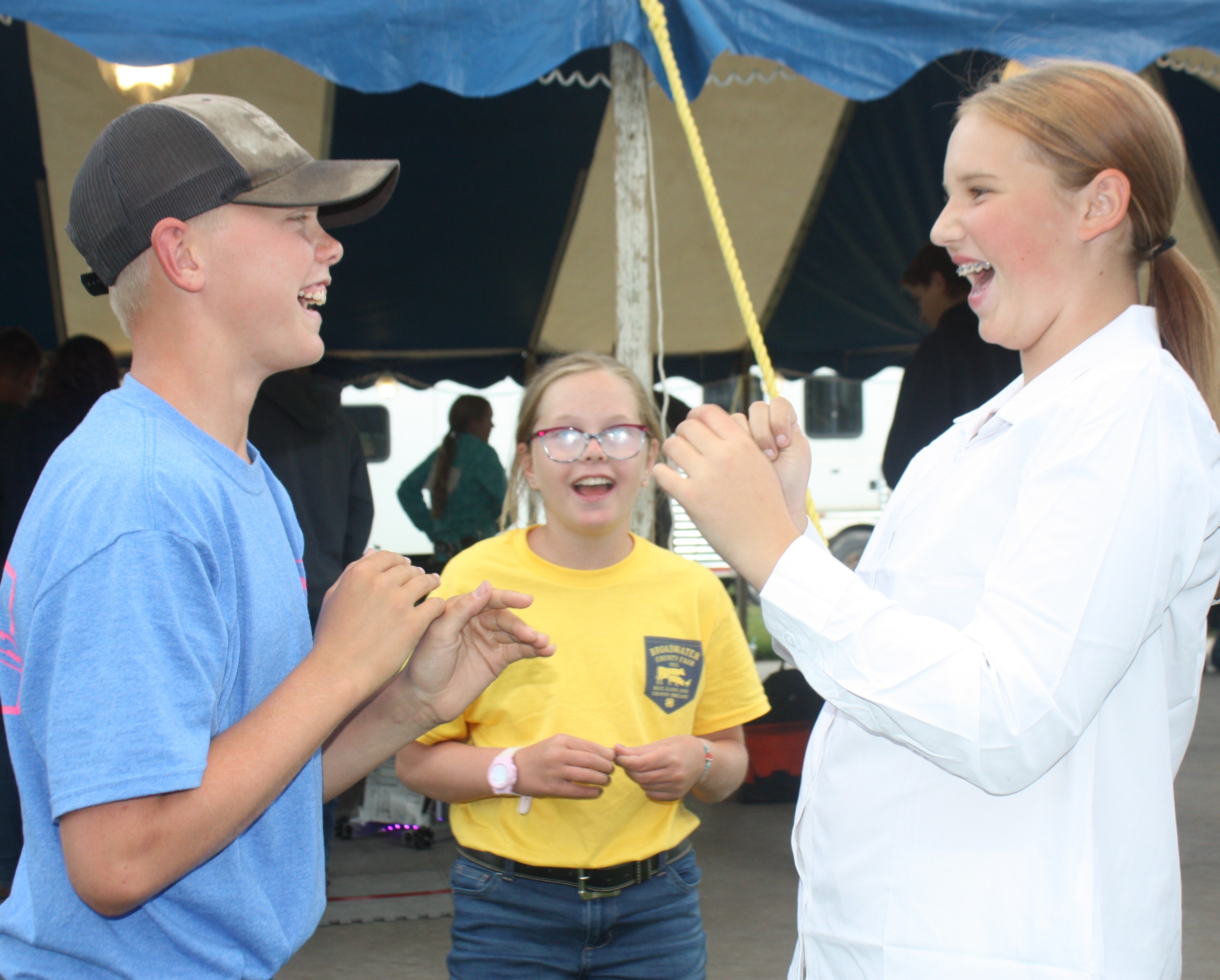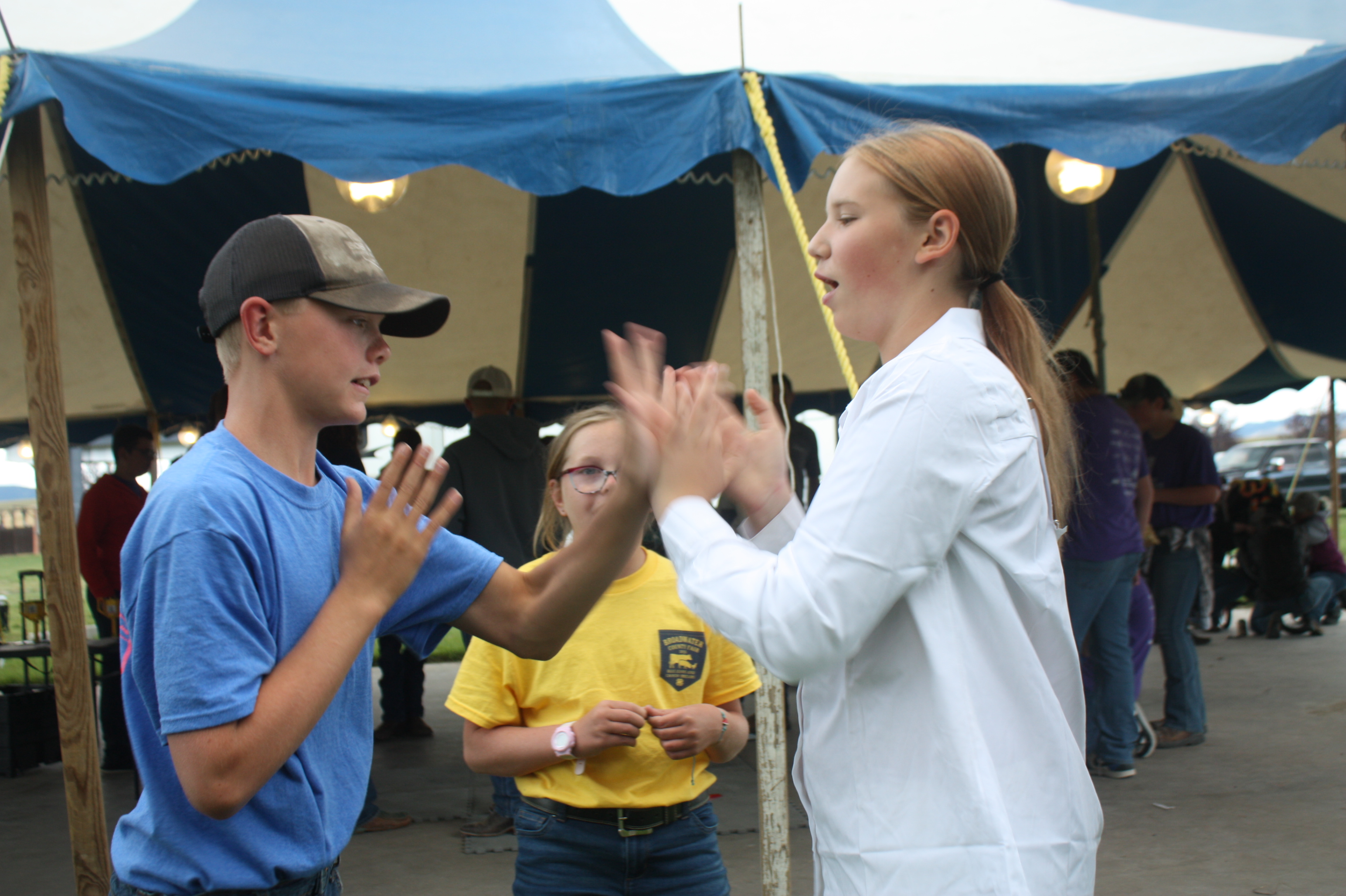 Image 4 Caption: Caleb Crusch and Madelyne Trusdell play a hand game called Avocado while Katey Crusch looks on.