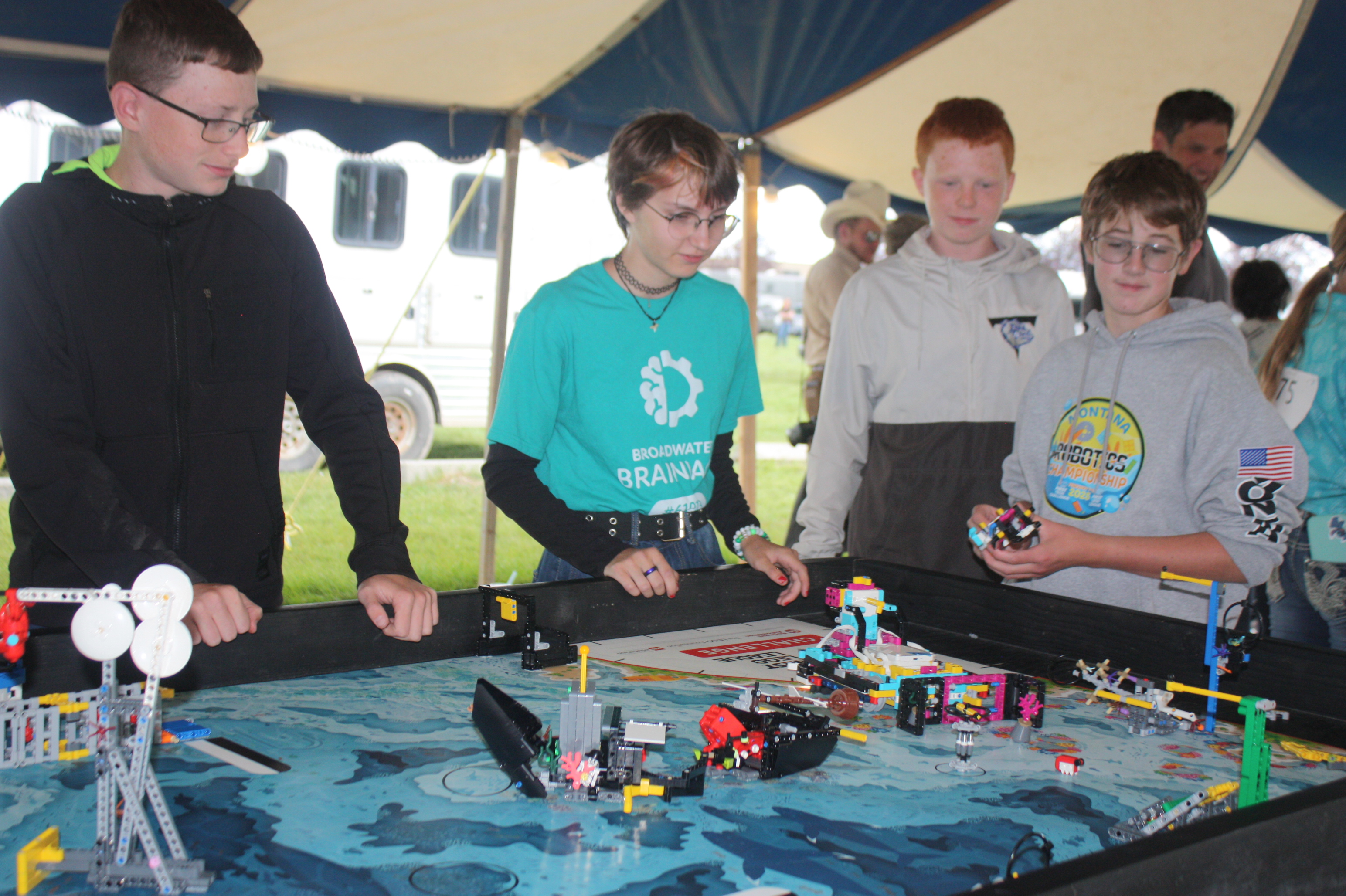 Image 1 Caption: Broadwater Robotics students Titus Kirksey, Sky Sellay, Everett Kirksey and Jayden Flynn use their new skills to focus on their projects. The team demonstrated their robot's capabilities as part of the county fair.