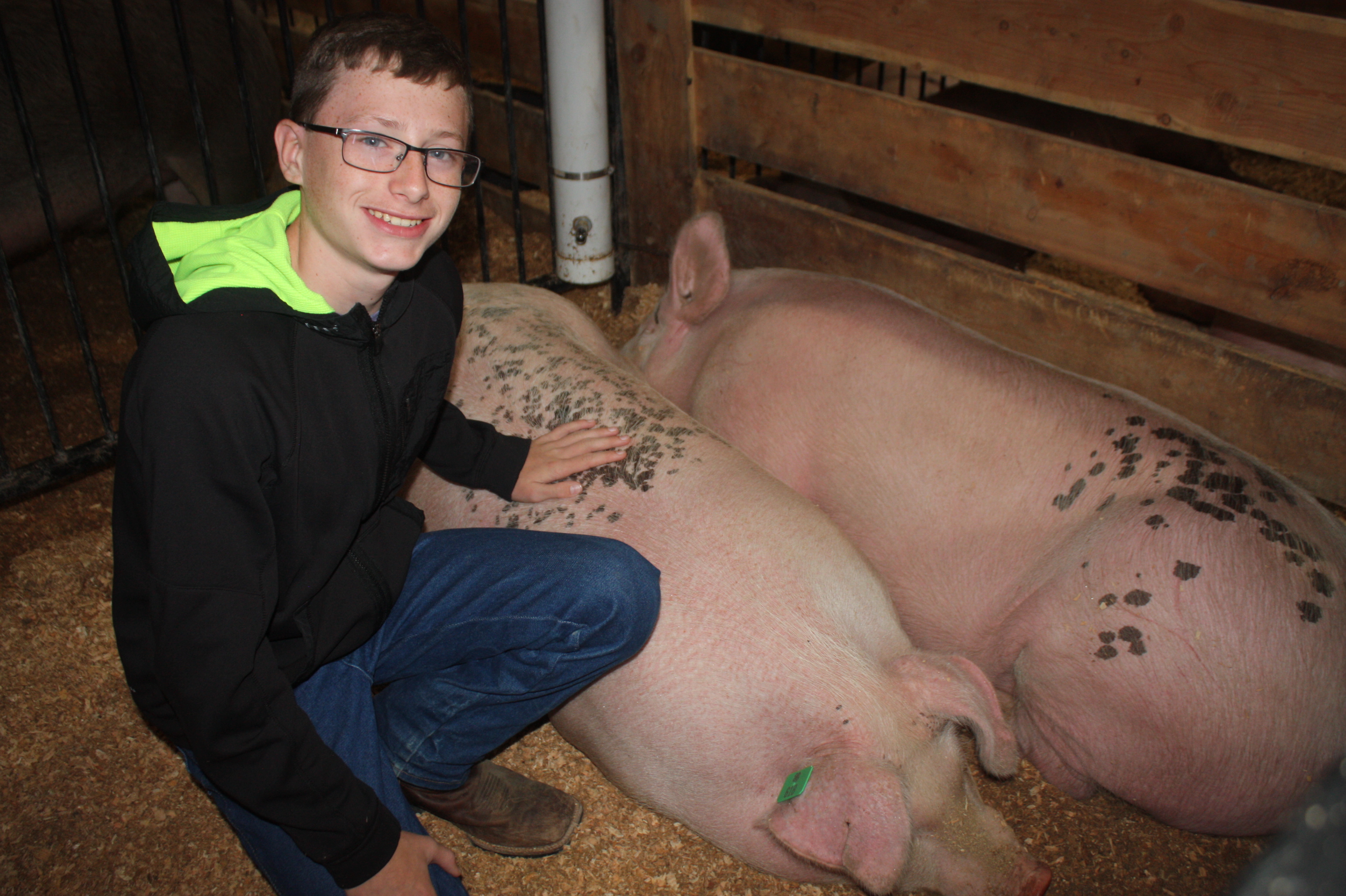 Image 3 Caption: Titus Kirksey, age 13, with his half Duroc, quarter Landrace and quarter Yorkshire hogs.