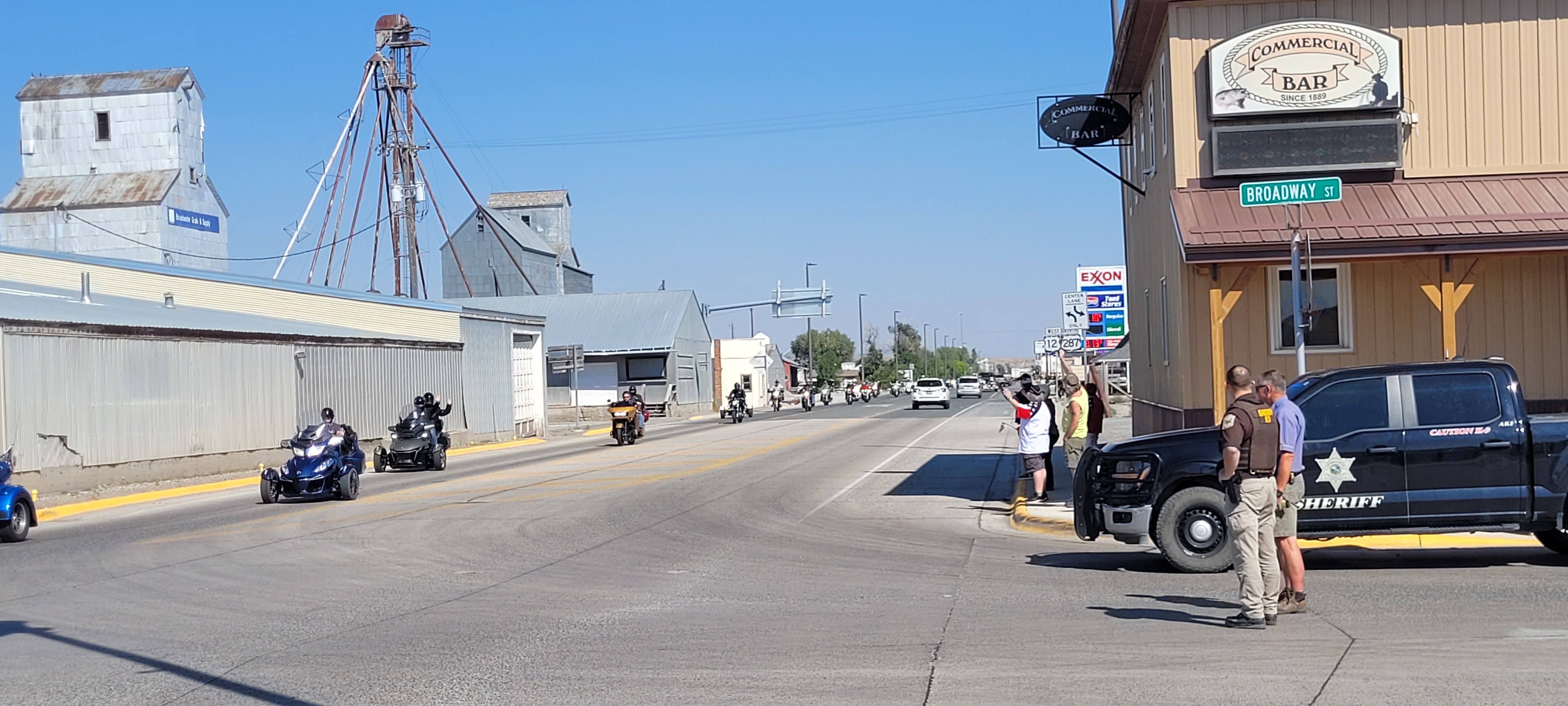 The roar could be heard for miles north before the motorcycles could be seen, escorted by a Lewis and Clark County Sheriff vehicle with all the lights flashing. Those who showed up began waving American flags and welcoming the riders as they drove down Highway 287.