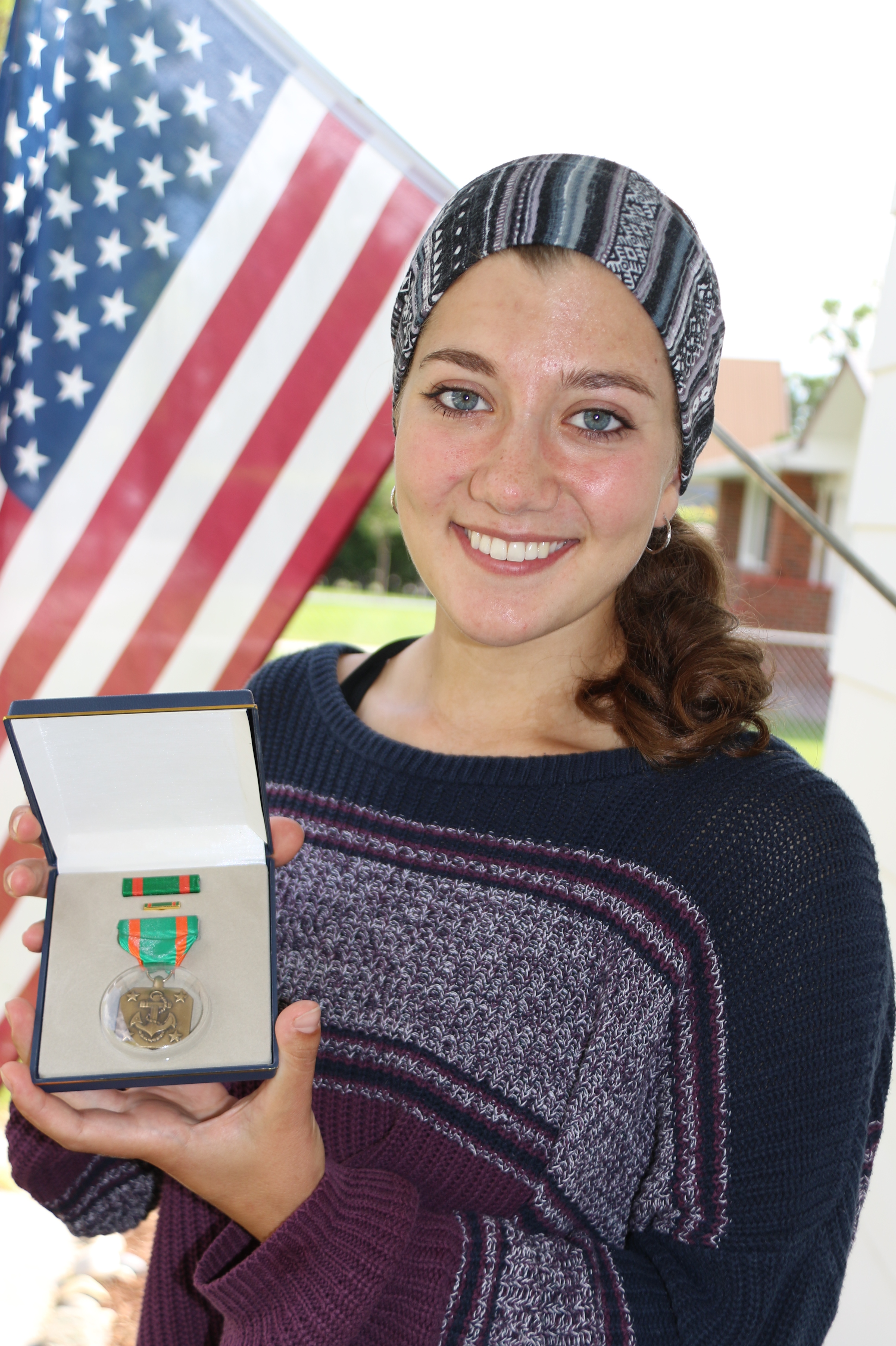 Image 2 Caption: RSP 2nd Class Eleanor Scout Lynde displays the ribbon for earning her NAM (Navy and Marine Corps Achievement Medal) while attached to the MAG-14 (Marine Aircraft Group 14) at Cherry Point, North Carolina. Photo by Matt Nelson