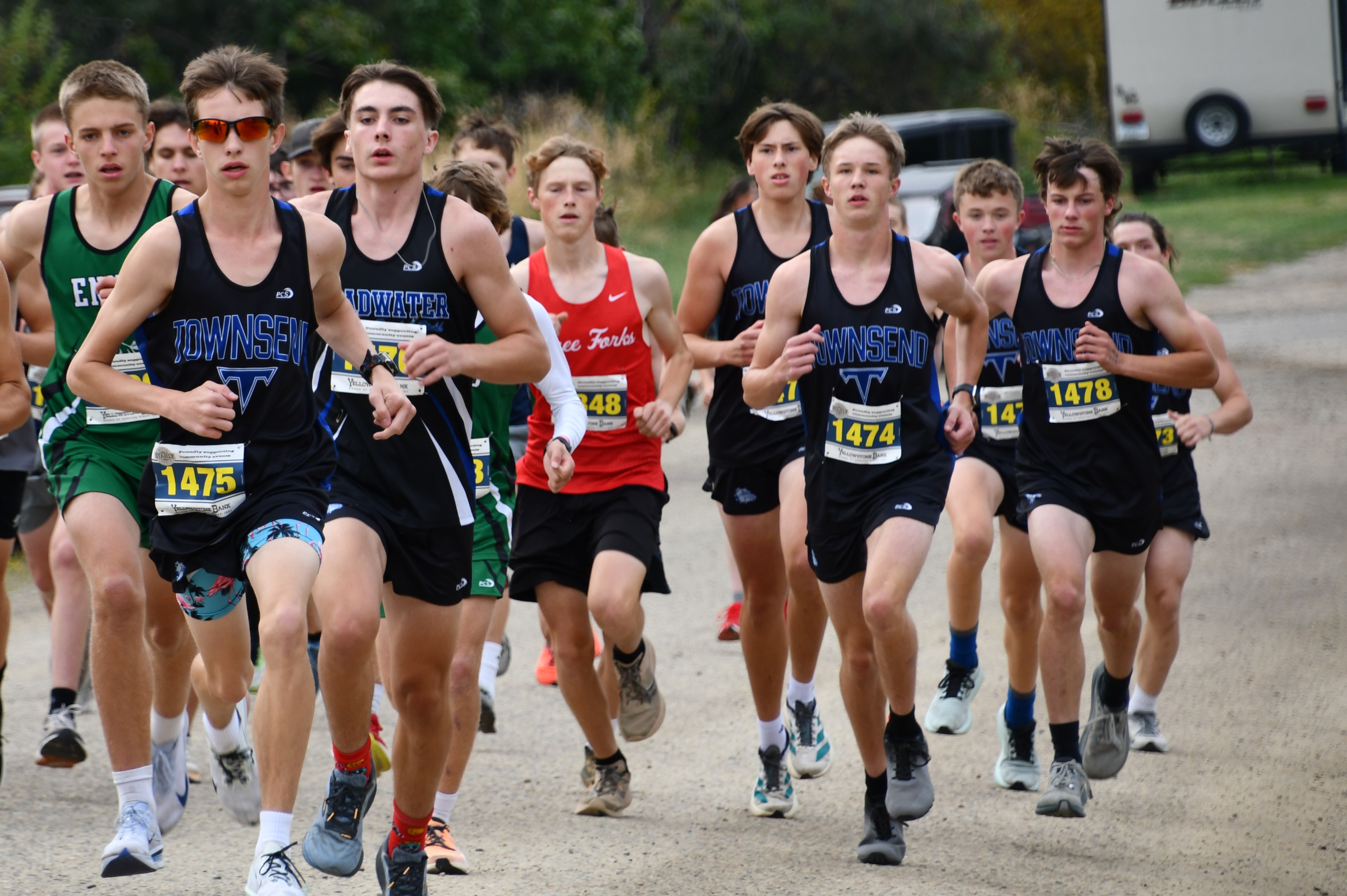 Image 1 Caption: Start of the men's varsity race with Bulldogs (L to R): Gavin Green, Rylan Hoveland, Keaton Cavasos, Dallas Fligge, Clayton Rice, Luke Tullos and Sam Flesch. The Three Forks Wolf in the red is former Townsend teammate Jacoby Berg.