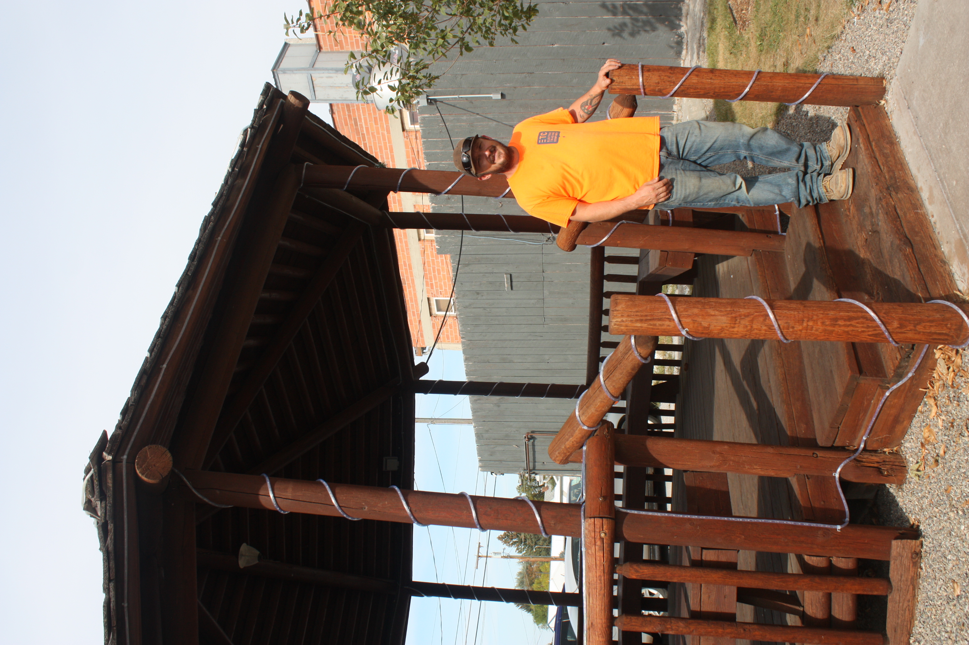 Image 2 Caption: Electrician Shawn Bucy finished installing night lighting at the gazebo on Broadway last week.