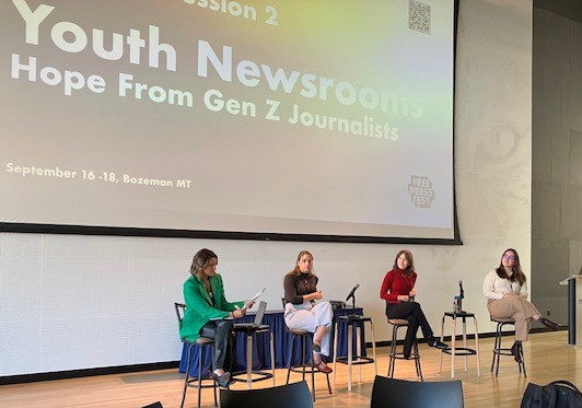 Image 1 Caption: High school, college and freelance journalists discuss Gen Z journalism at Montana Free Press Conference in Bozeman at Montana State University. From left: Moderator Maritsa Georgiou, freelance journalist and former Kaimin newspaper editor Claire Bernard, Charles M. Russell High School student newspaper editor Malena Gangi and MSU Exponent newspaper editor-in-chief Amanda Fulton.