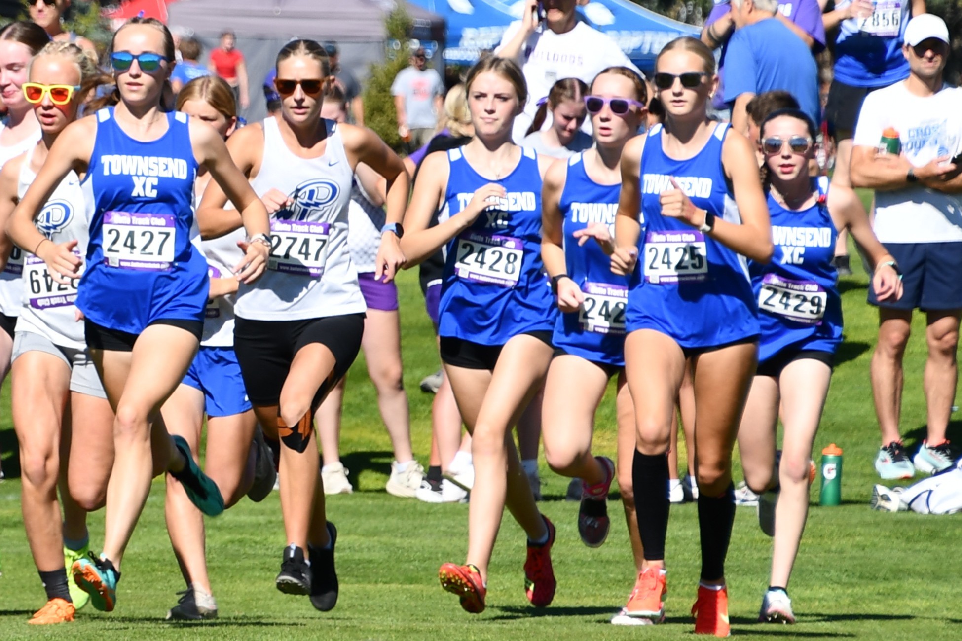 Image 1 Caption: Lady Bulldogs fly off the start at the Butte Invitational (in blue, l to r: Kyla Meissner, Addy Mosher, Bella McDaniel, Elaine McDaniel, and Tana Santi.