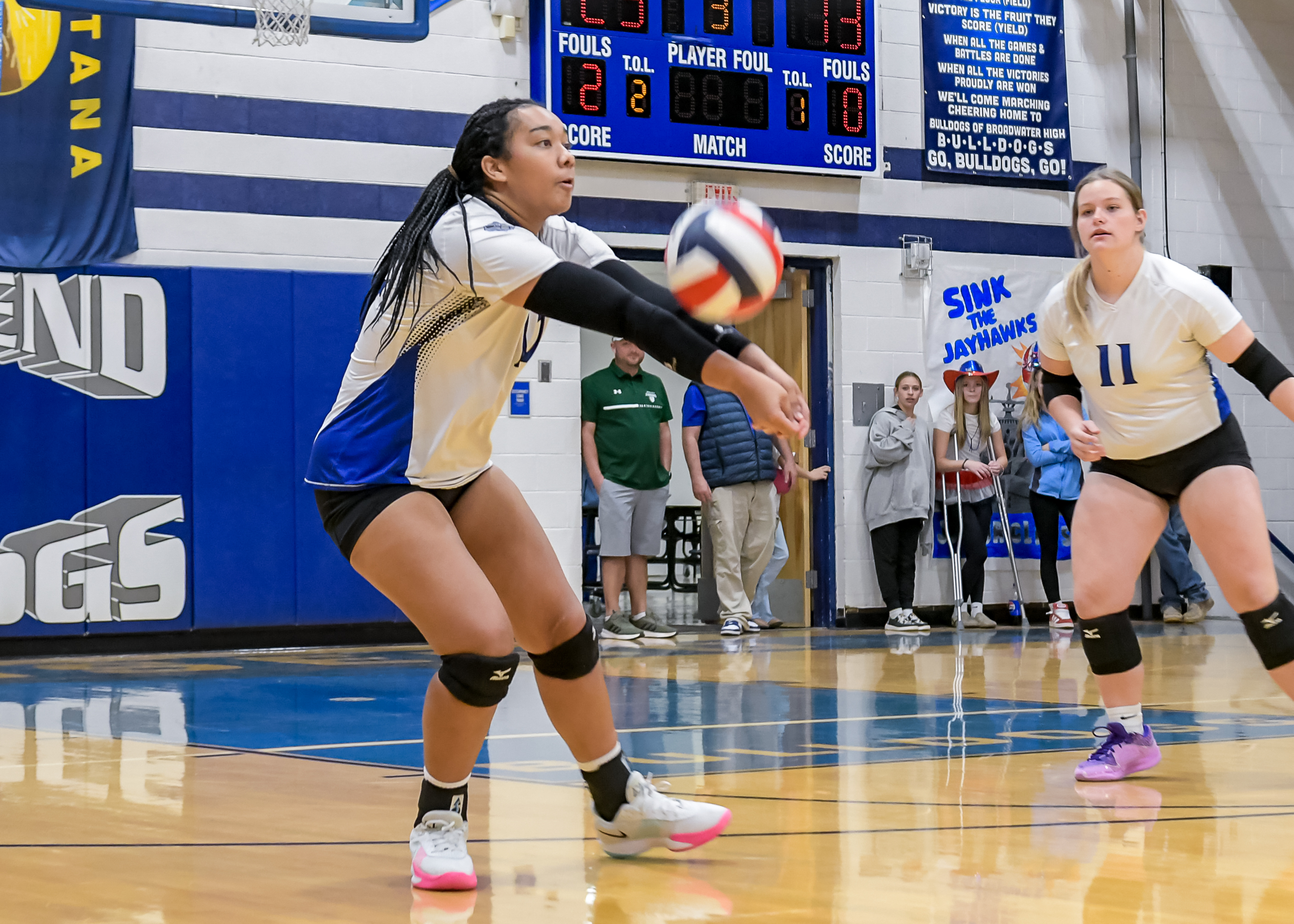 Image 2 Caption: The Bulldog's Mishayla Lambott with the dig, during last Thursday's match with the Joliet J-Hawks.