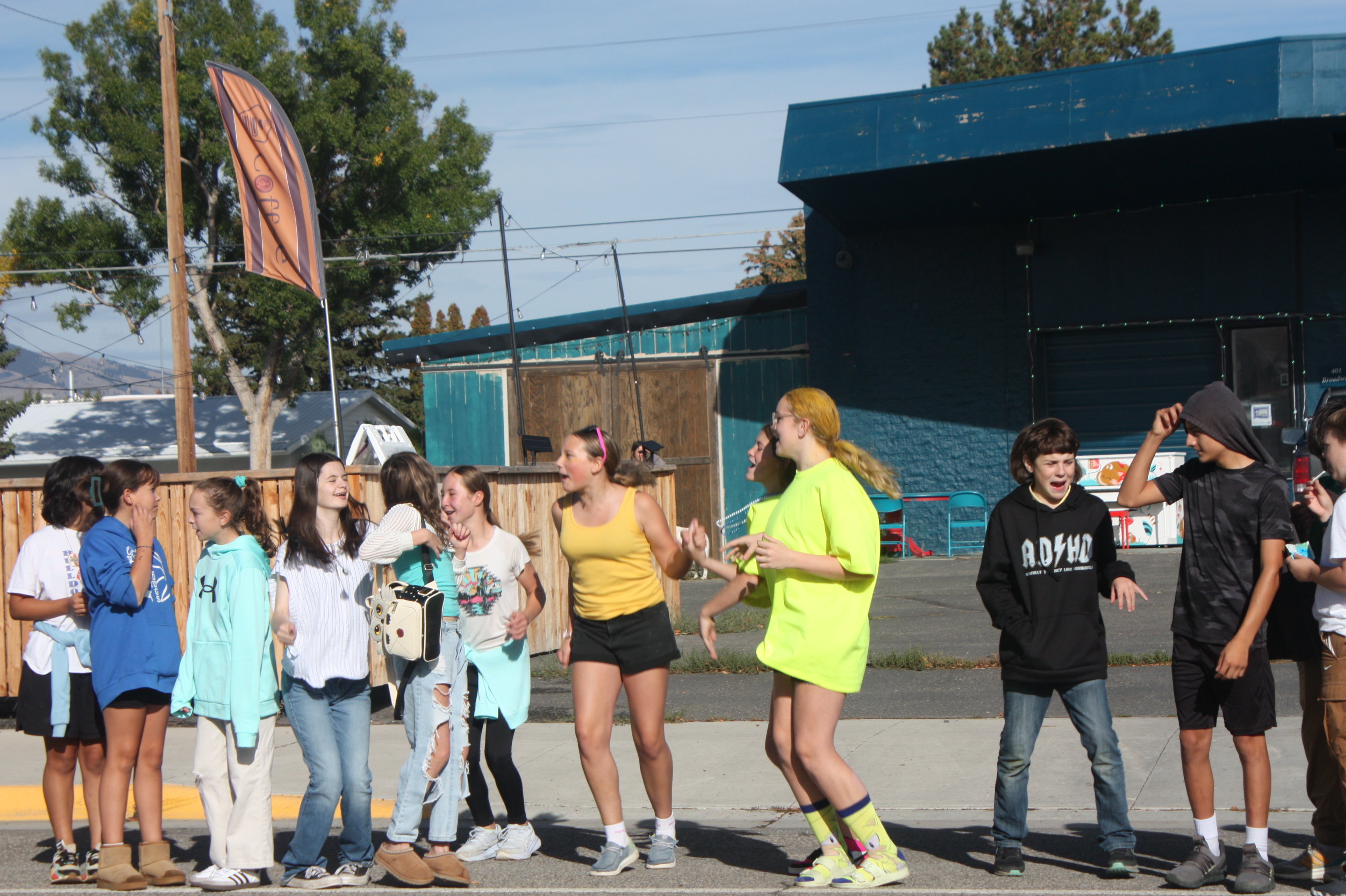 Image 1 Caption: Junior High and high schoolers cheer on parade floats and band.