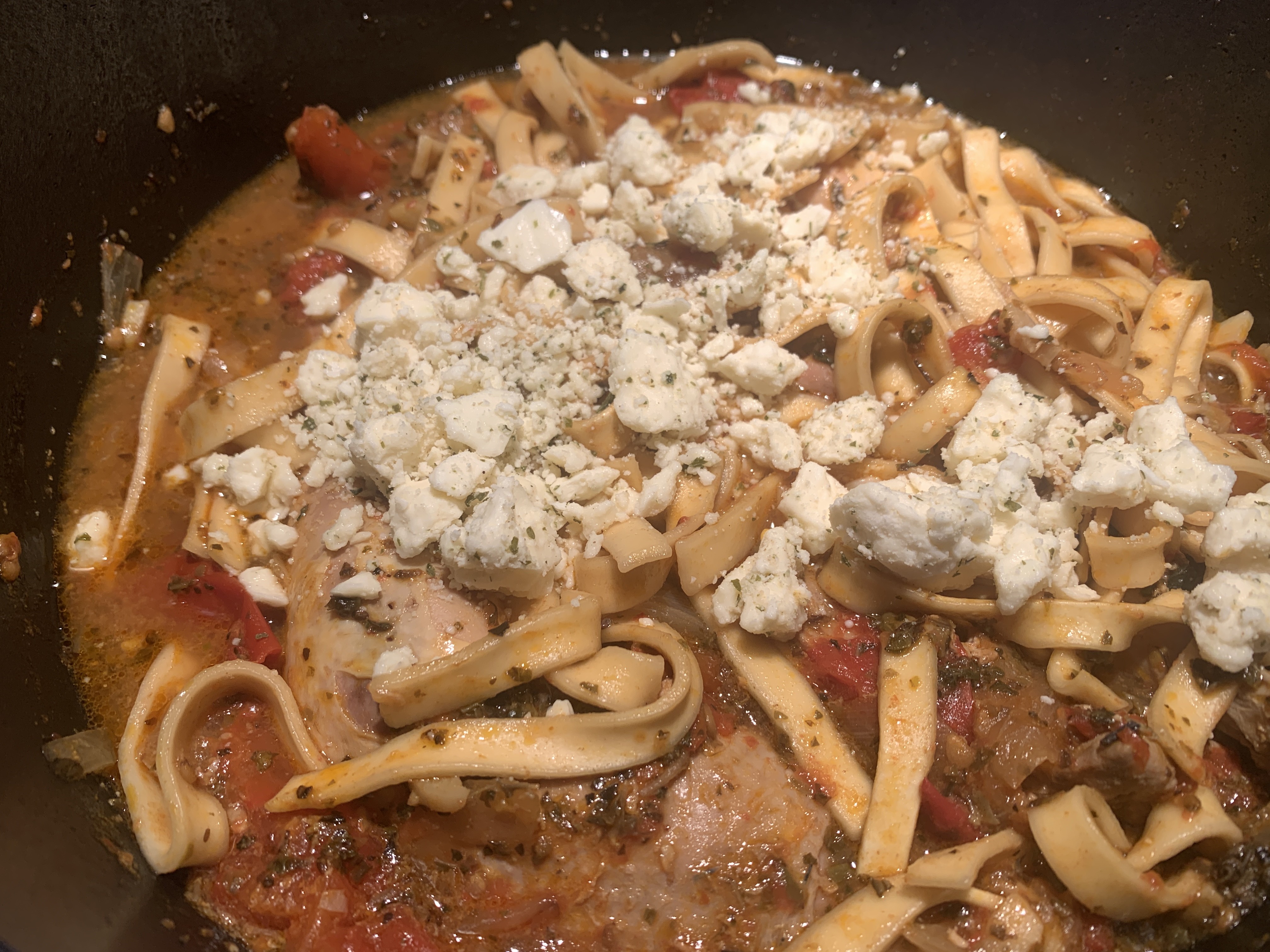 2. Clear a small opening in the middle of the onions and add the garlic with a bit more oil. Cook another 3-4 minutes, stir the garlic up into the onions, then gently stir in the chopped tomatoes, water, chicken base, red chili flakes and basil. Bury the pheasant pieces into the mixture.