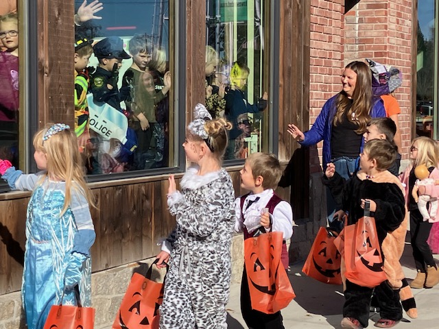 Image 1 Caption: The little ones at the preschool on Broadway are seen here waving to Townsend Elementary School students as they parade by on Thursday, Oct. 30th in their finest Halloween costumes. School was closed on Oct. 31st, a Friday.