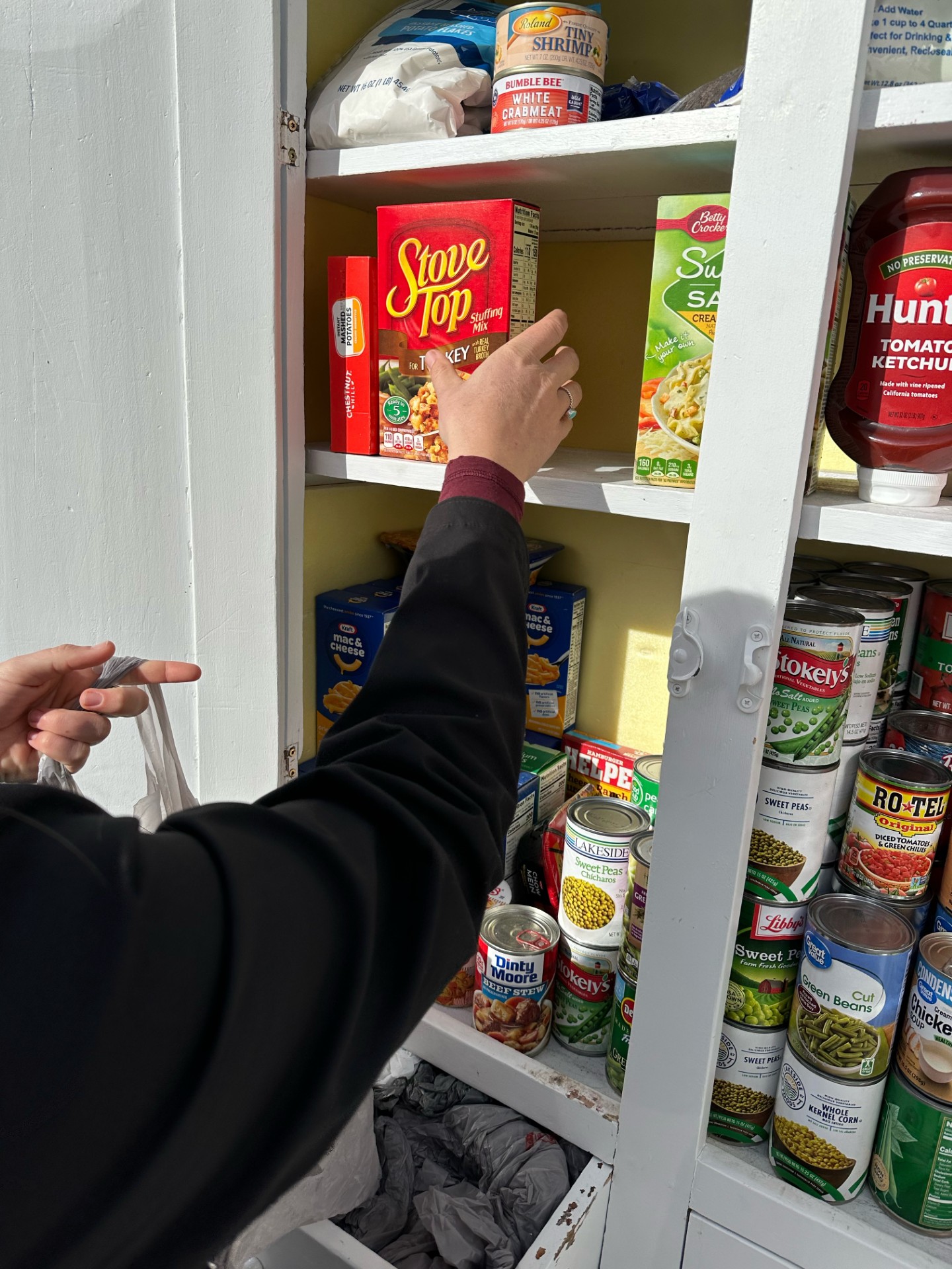 Donors can place items inside the pantry cabinet, neatly, at any time of day. A list of suggested foods is available at the Little Pantry or on the Facebook page.
