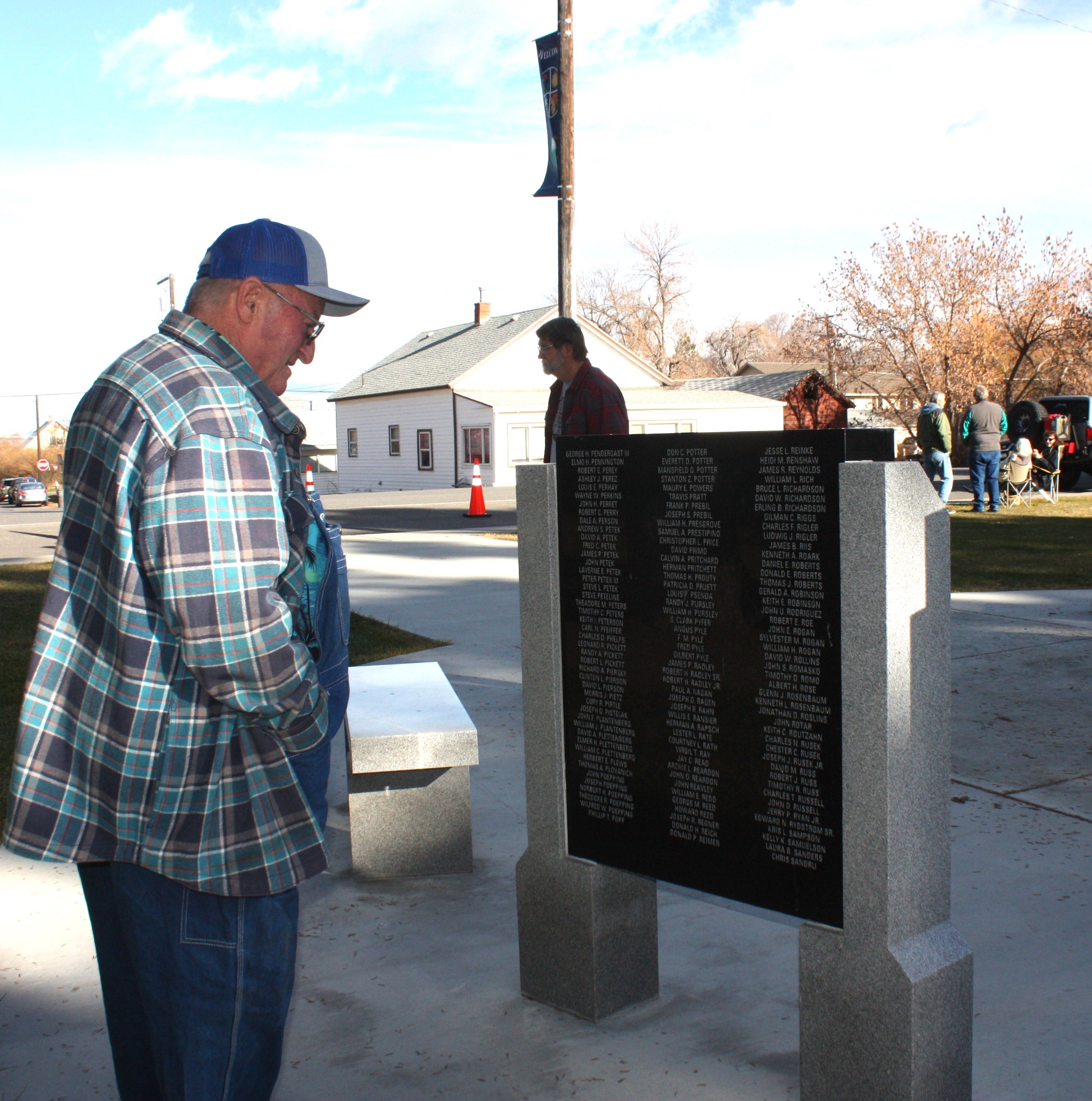 Image 3 Caption: Bill Casey views the names of his uncles who served in WWII. The new monuments hold hundreds of East Helena and surrounding area names of those who served.