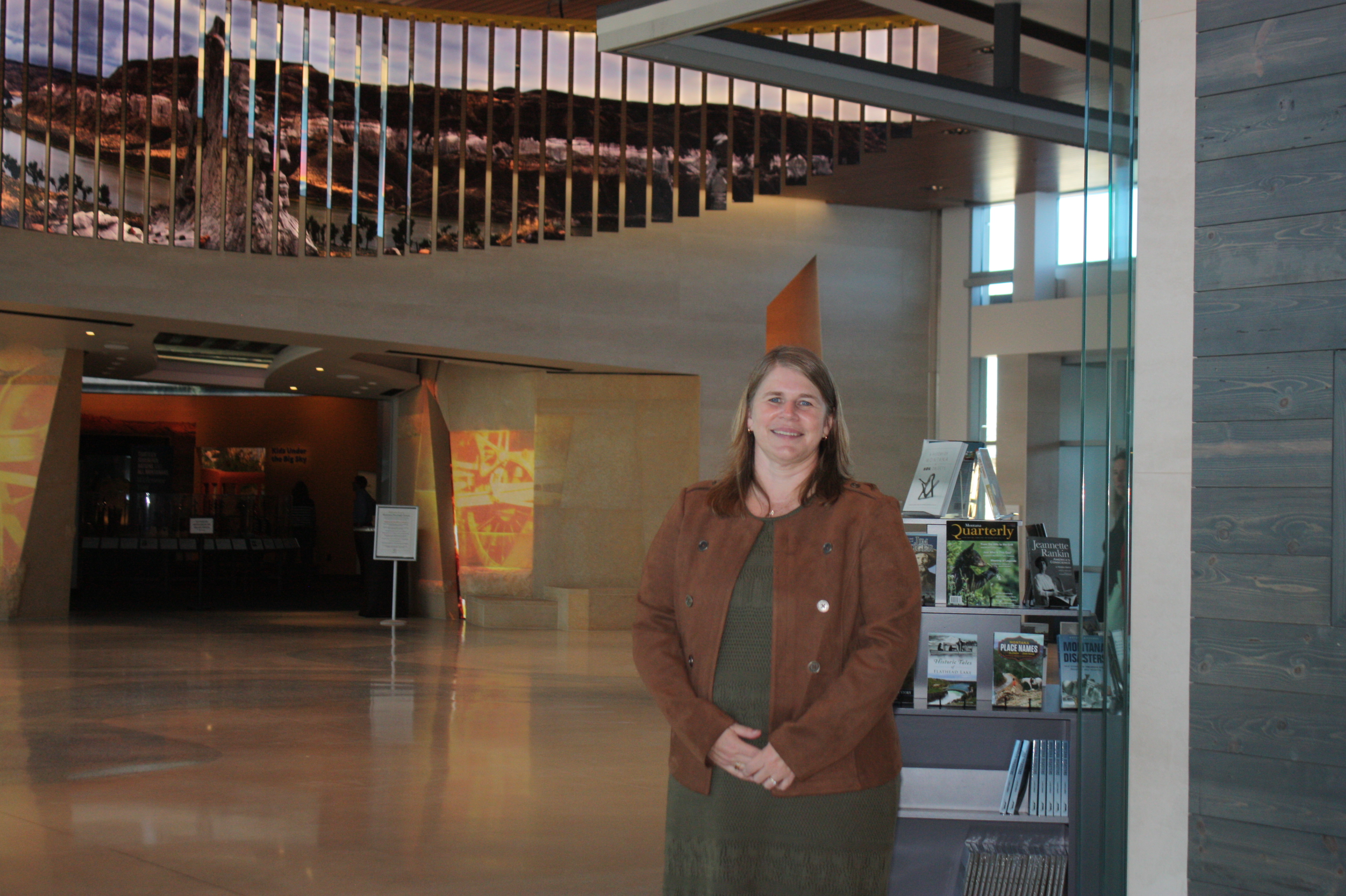 Image 1 Caption: Montana Heritage Center Director Molly Kruckenburg stands in the expansive Lobby of the new center, now open to the public.