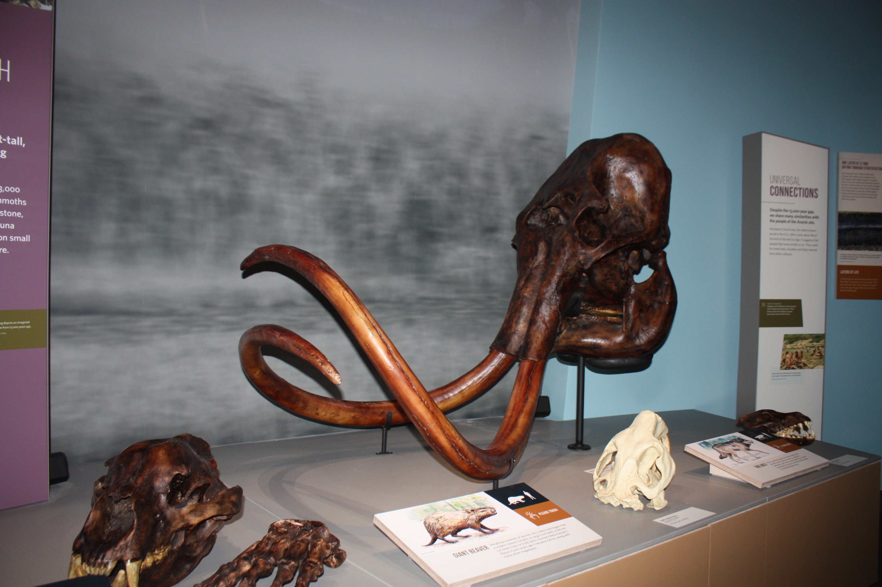 Image 2 Caption: The exhibit in the Prehistoric section displays the actual head and horns of a wooly mammoth along with a wild pig.