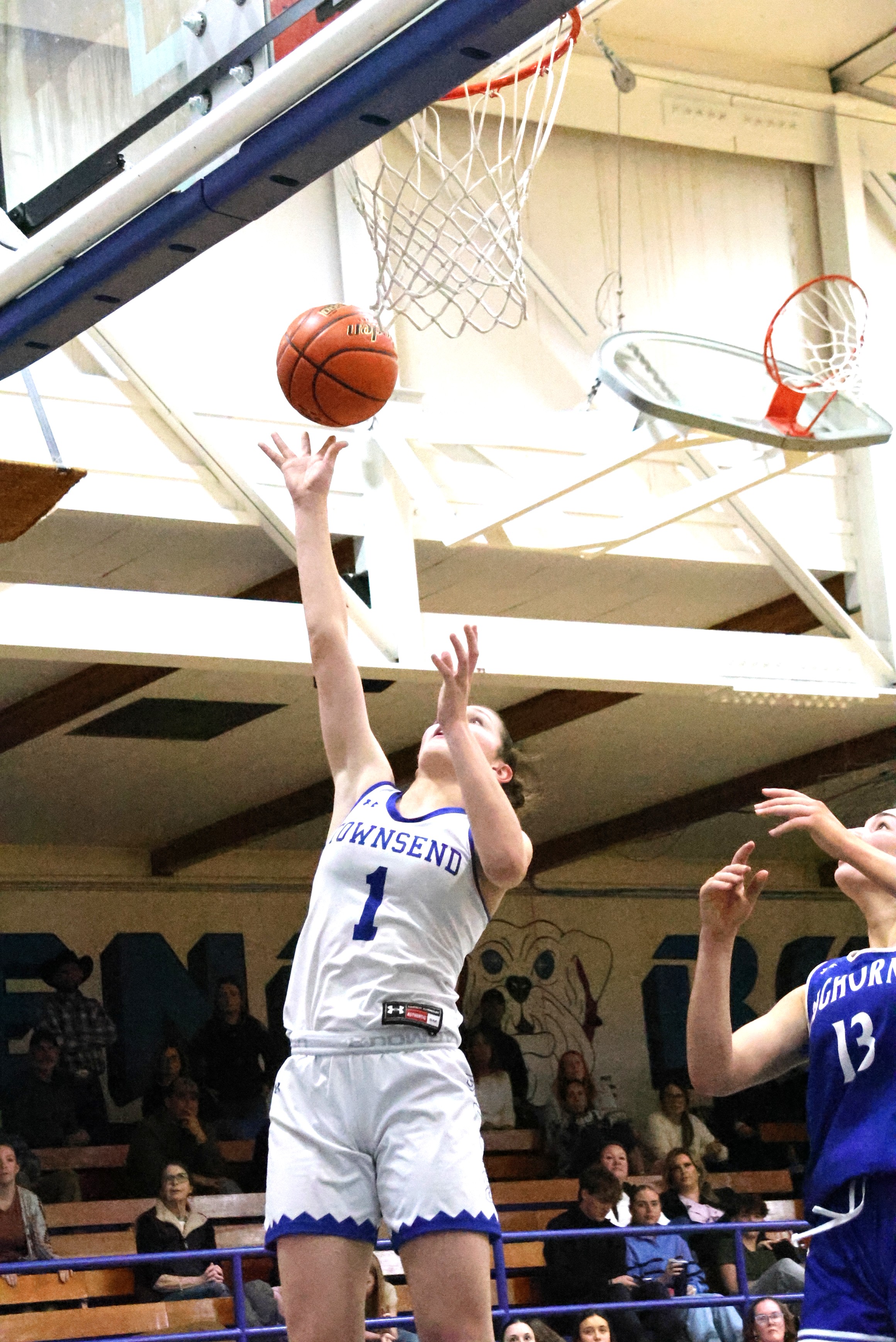 Image 1 Caption: Kaitlyn Noyes lays the ball in the basket against Lone Pine.