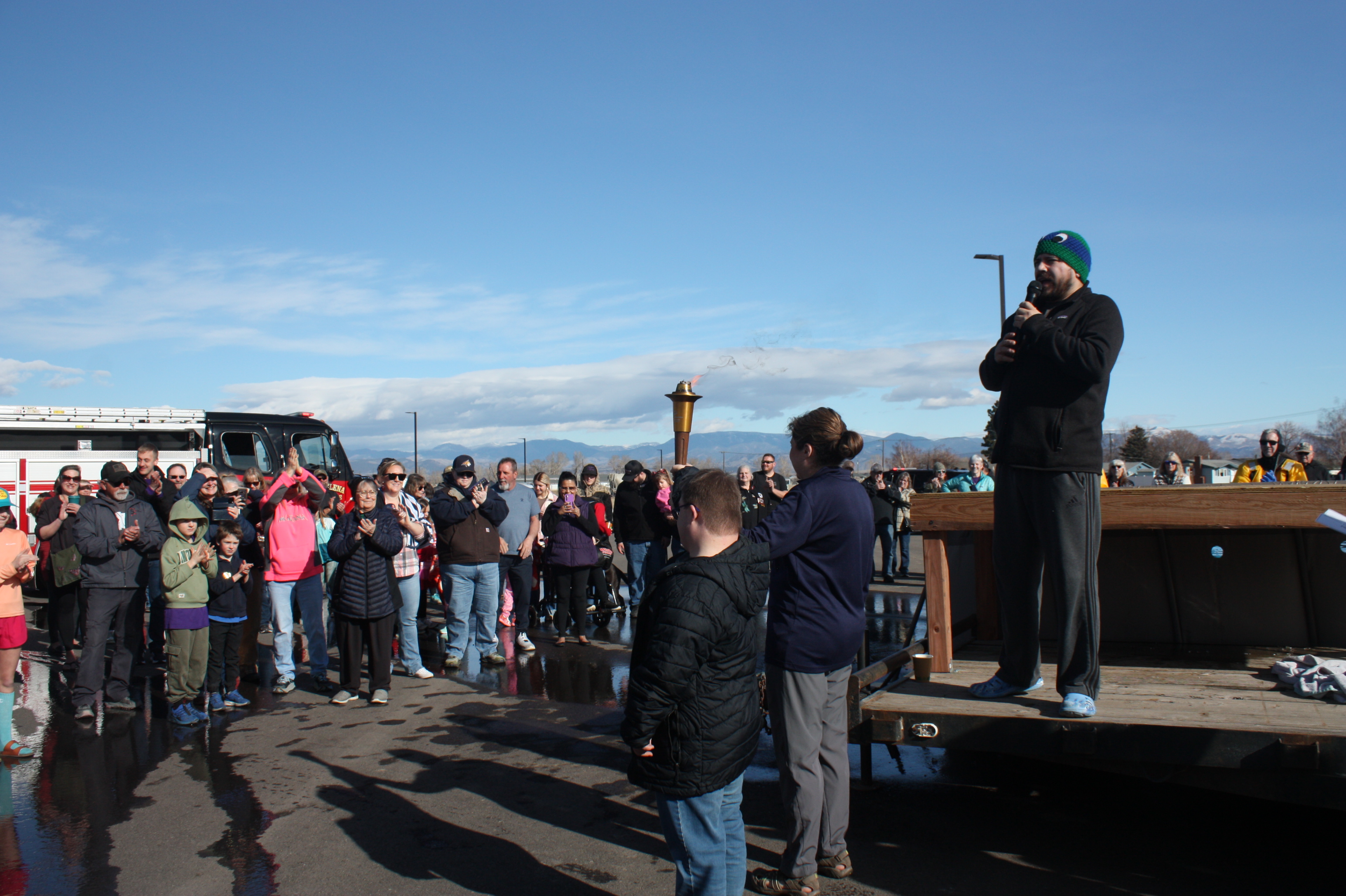 Image 4 Caption: Helena Halos Special Olympics Athlete, Tanner Davis, presents the torch, accompanied by Lewis & Clark Sheriff's Deputy Alicia Bragg. Emceeing the event was Torch Run Director Sargeant Domingo Leveque-Zapata.