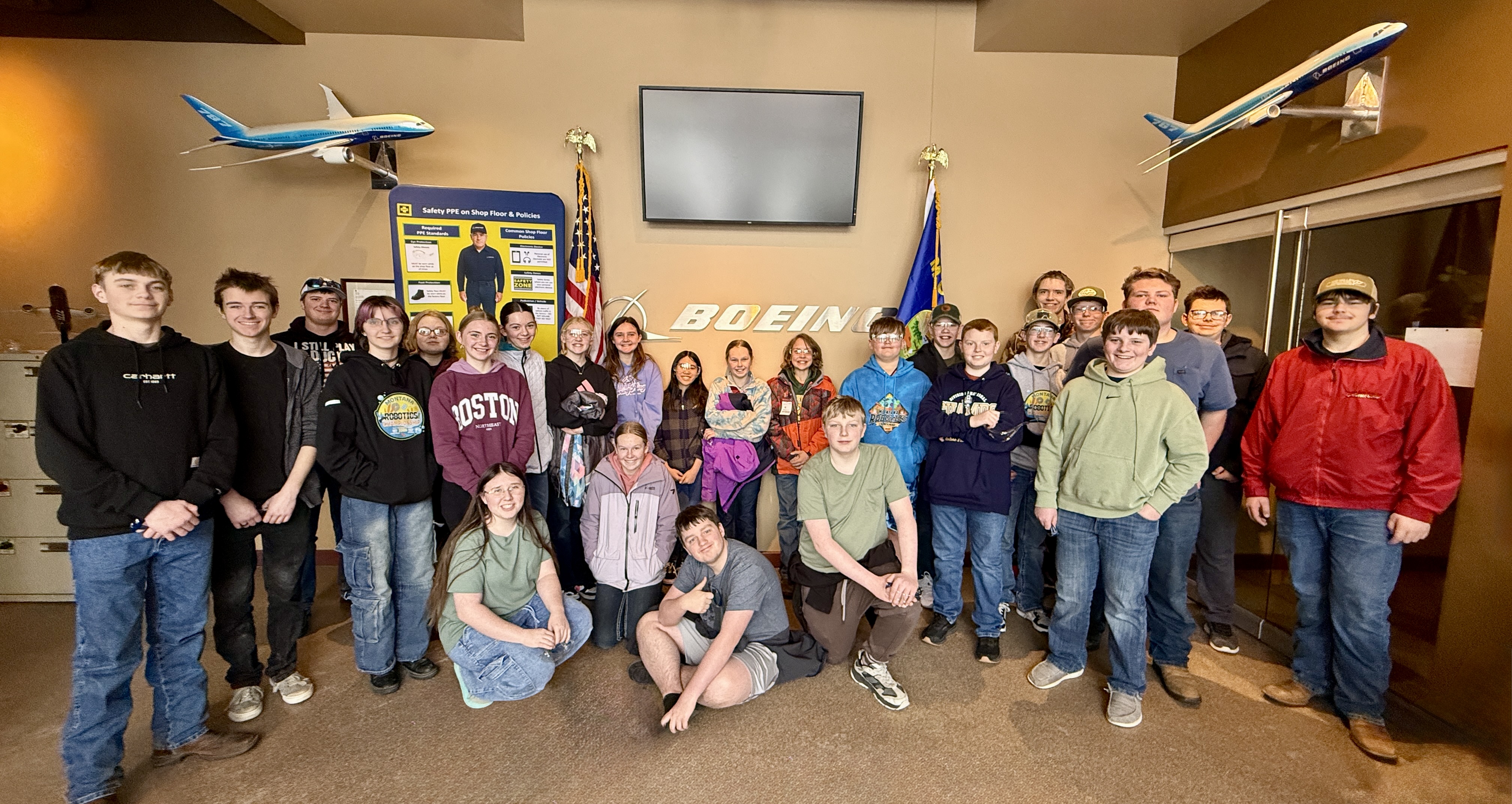 Image 1 Caption: The Broadwater Robotics team gathers in the Boeing Helena lobby during their visit, with model aircraft displayed behind them.