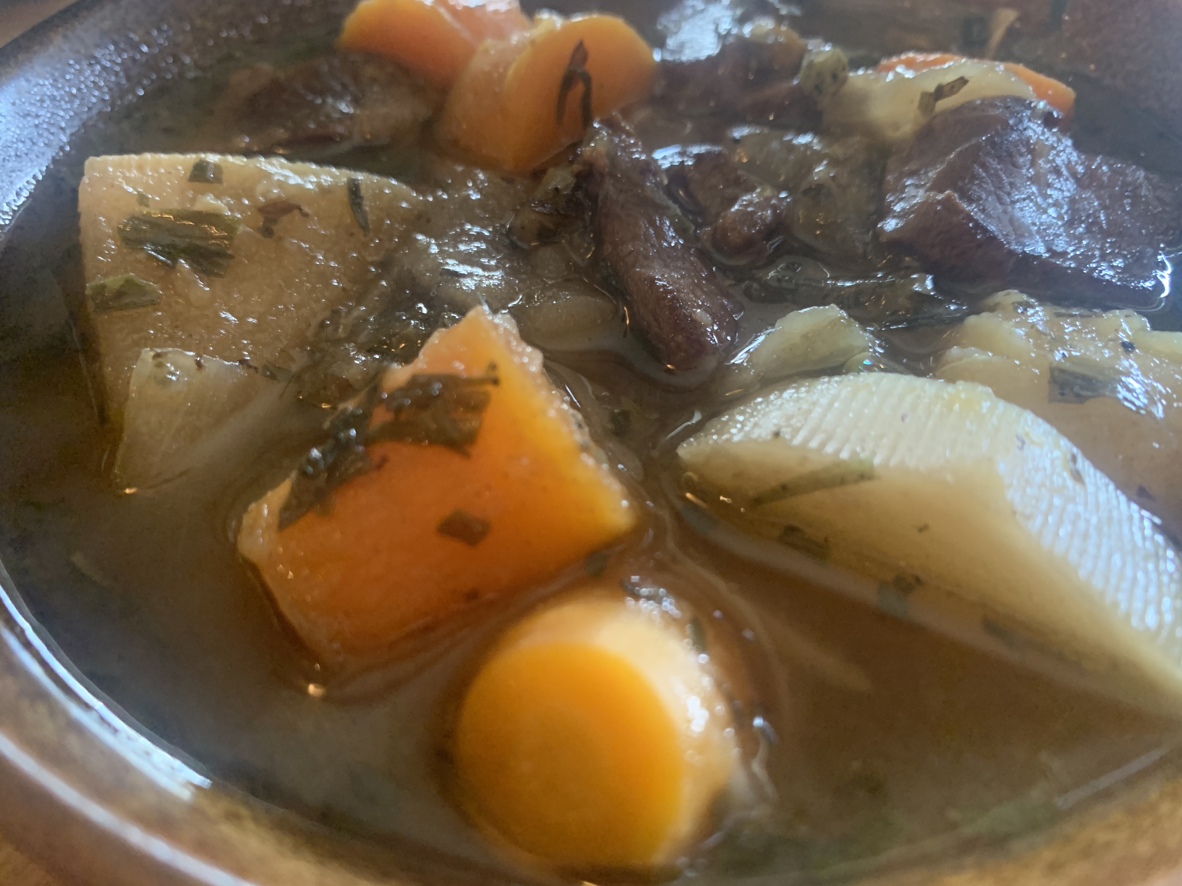 1. Dry the meat with paper towels and set aside. In a 5-quart Dutch oven, start the water over high heat and add the veggies. In a large skillet, heat the first tablespoon of oil over medium heat. Brown the meat chunks on at least two sides in batches so you don’t overcrowd the pan. (6-8 ounces in each batch.) Add more oil as needed. Transfer each batch to a bowl, then lower the heat to medium-low and sauté the onion, adding more oil as necessary. When the onions are translucent and starting to brown on the edges, return the meat to the skillet and stir the chicken soup base, tarragon, rosemary, salt and pepper into the meat and onions, then pour all that into the Dutch oven. Add some water to the skillet, scrape up the caramelized bits and add that to the Dutch oven with the rest of the water.